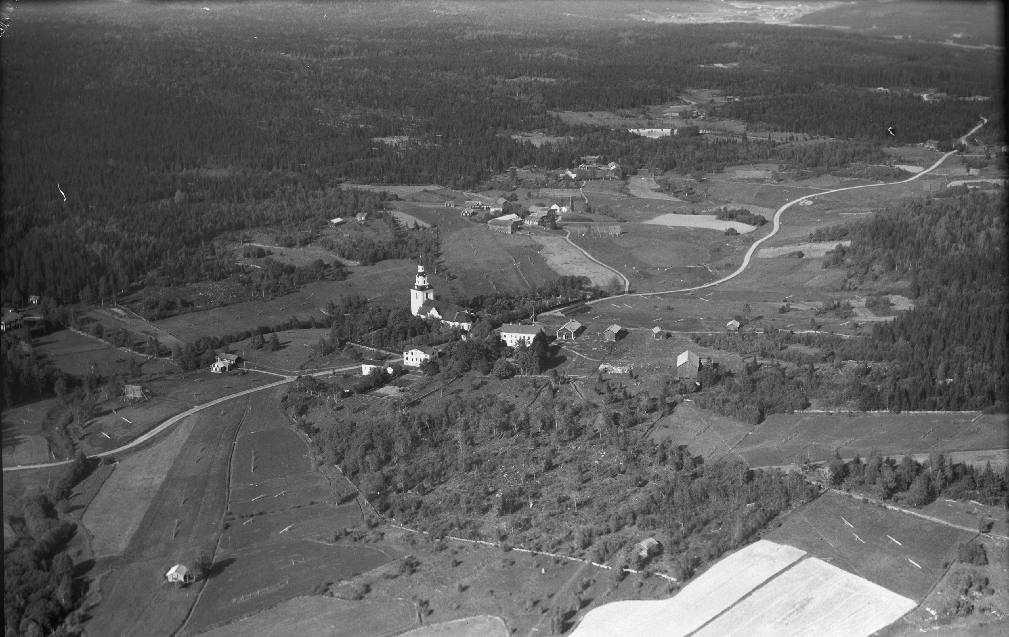 Beskrivning: Kyrkan med omgivning. Flygbild.