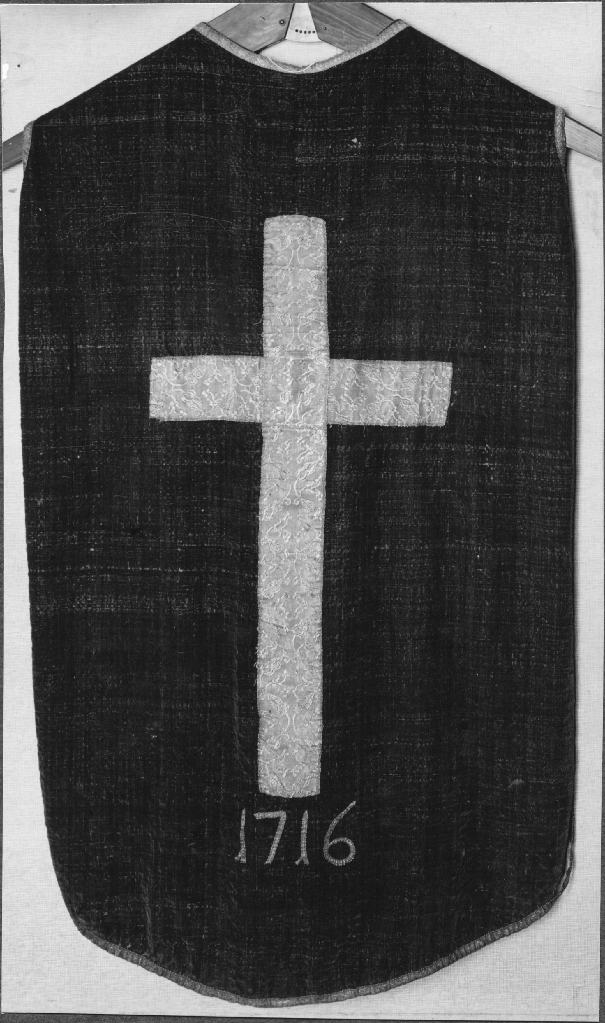 Beskrivning: Mässhake i röd schagg. 1716. baksida. Före konservering.