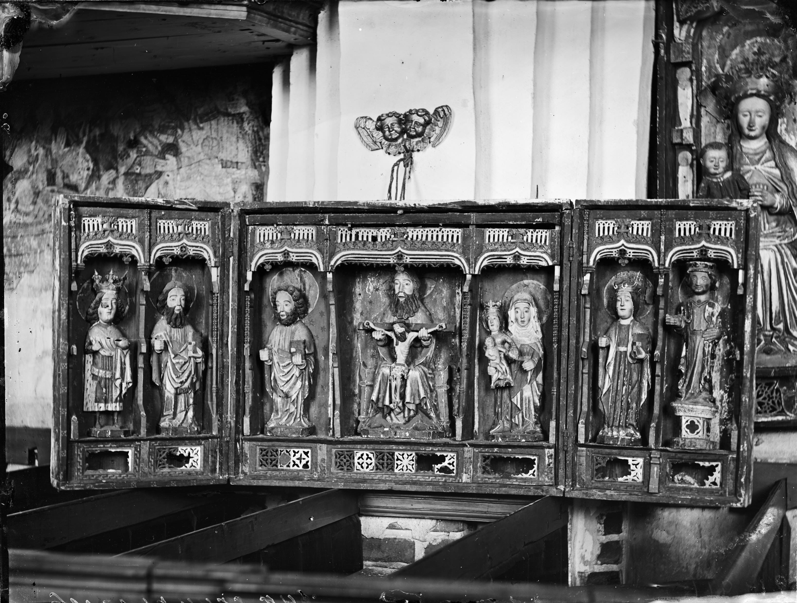 Beskrivning: Altarskåp, 1400-talets senare del. Inhemskt arbete. I mitten en Nådastol.