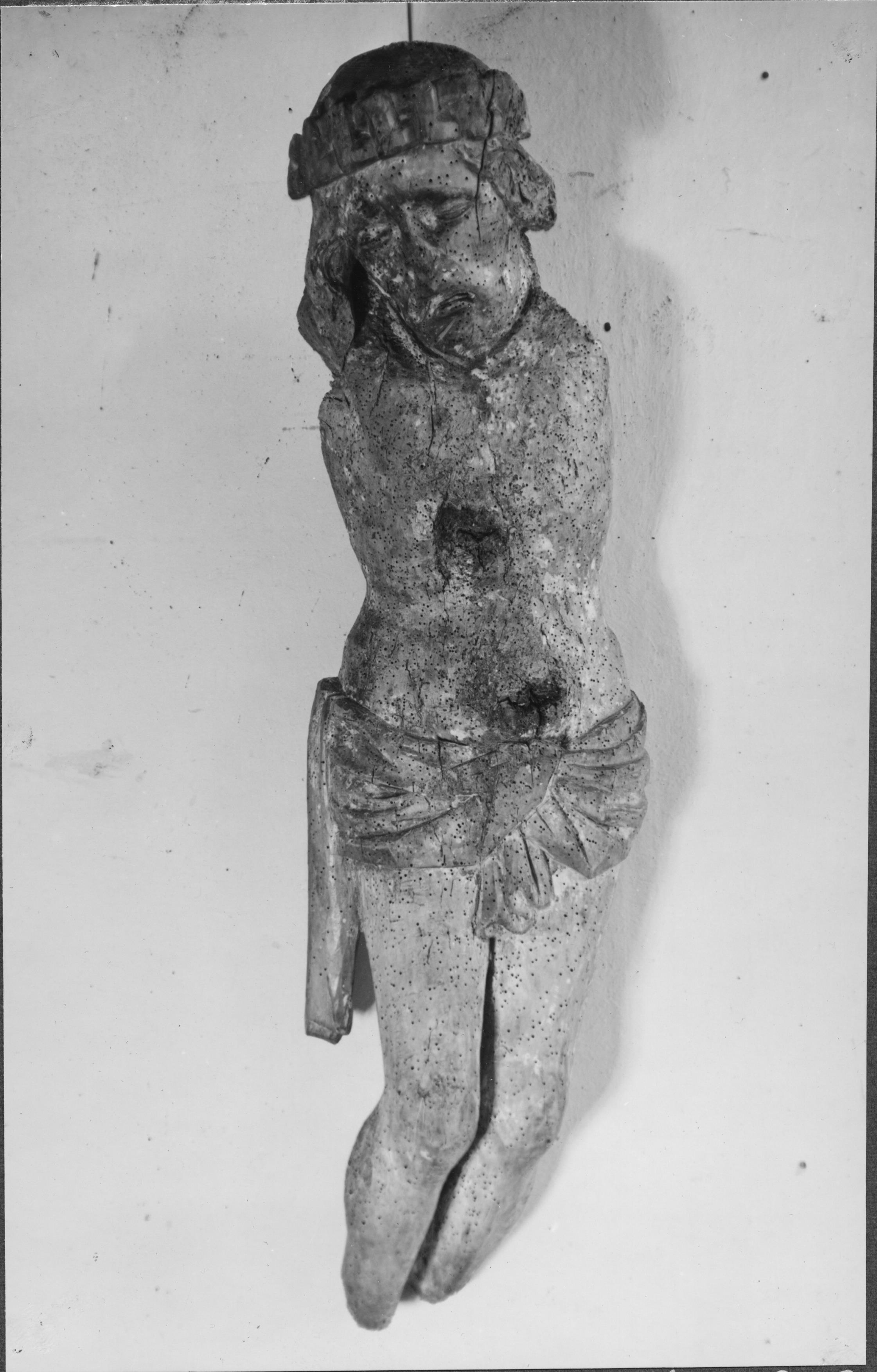 Beskrivning: Skulptur i trä föreställande krucifix utan kors.