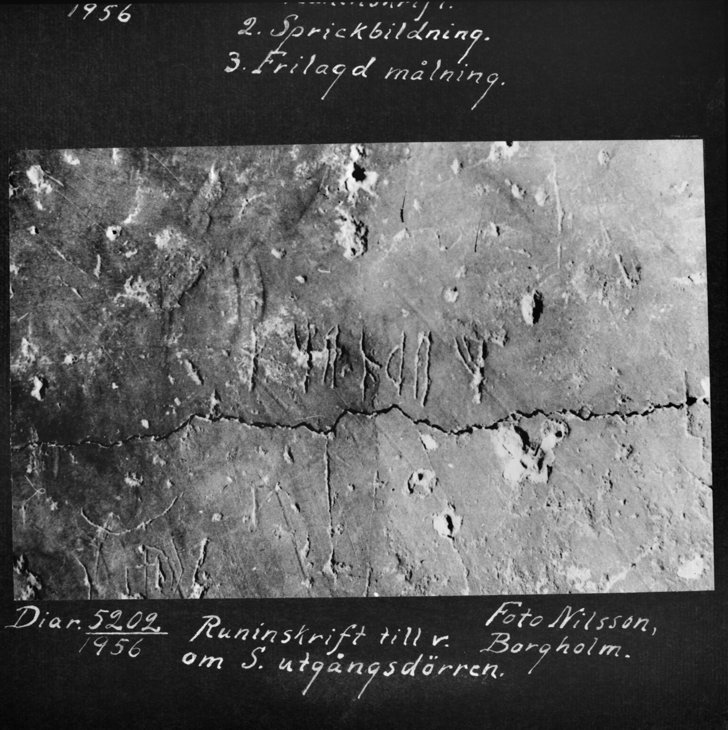 Beskrivning: Runinskrift till vänster om södra utgångsdörren.