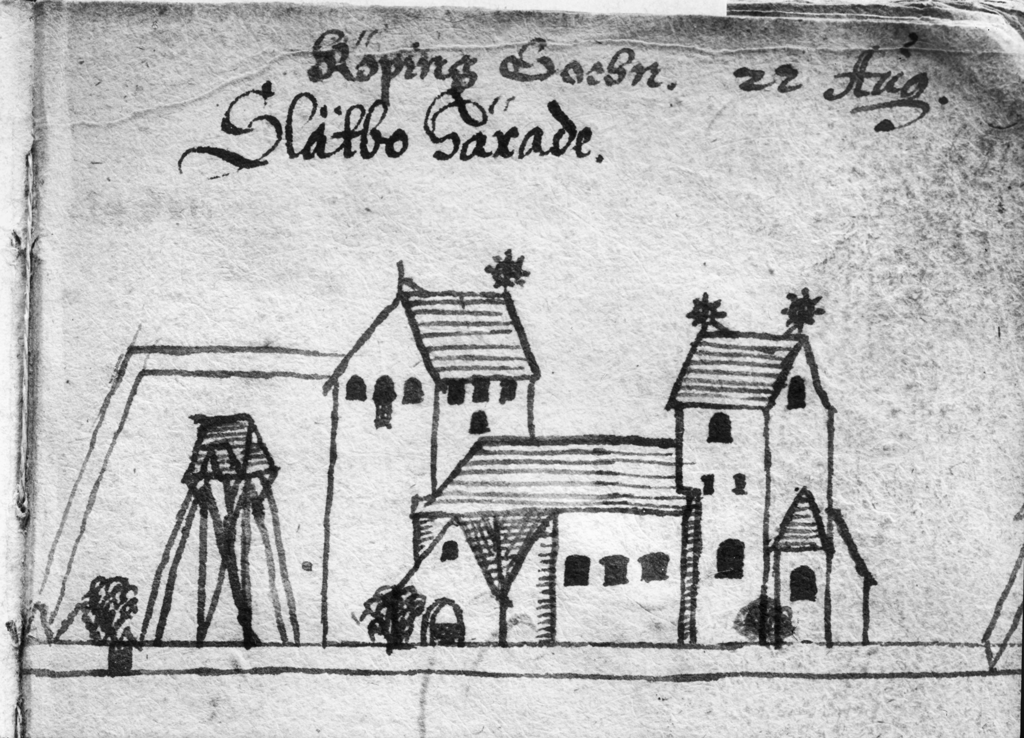 Beskrivning: Teckning av kyrkan från söder. Ur Rhezelius, Ölands Runstenar. KB.