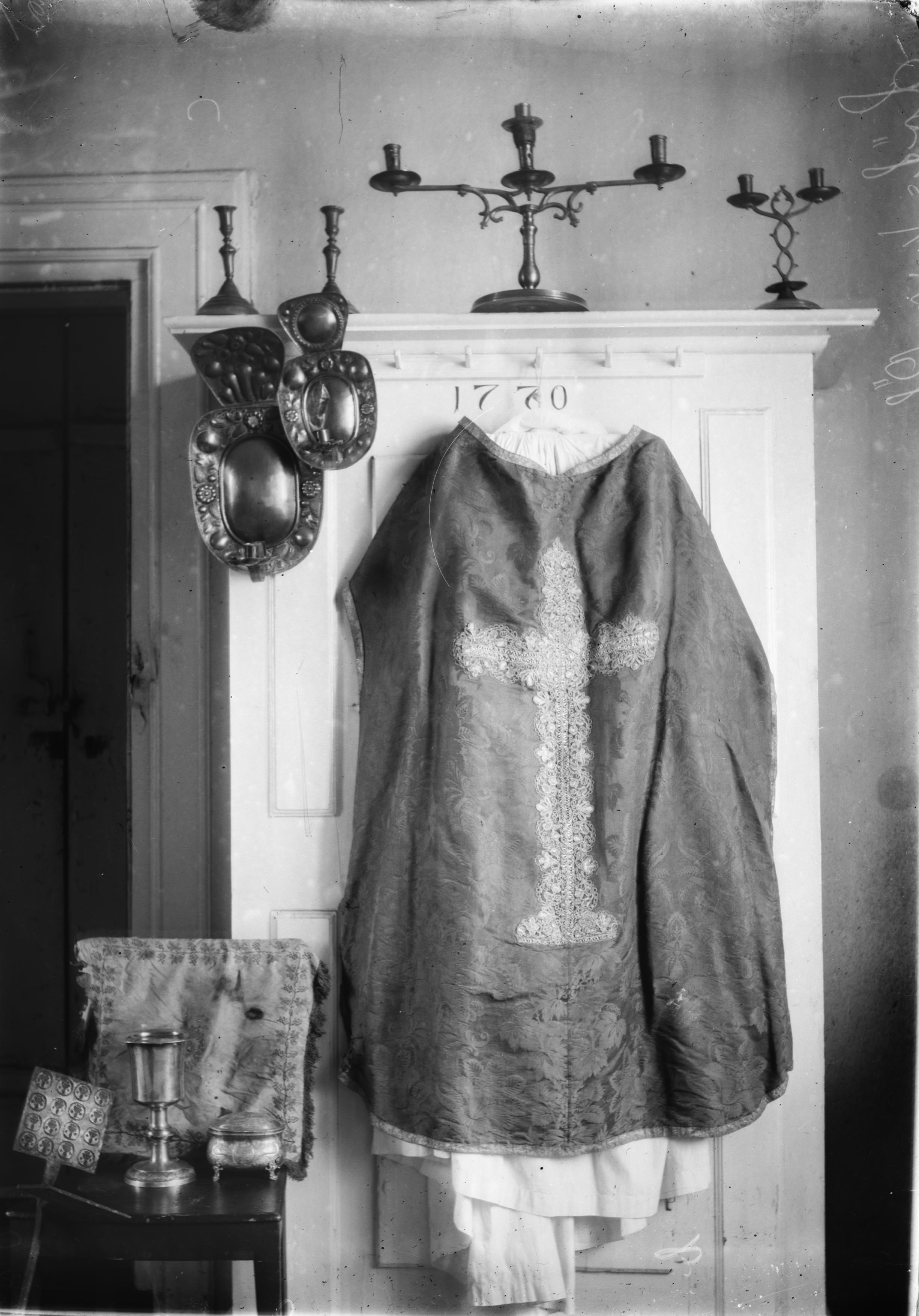 Beskrivning: Bild med kalk, oblatask, oblatjärn mm.