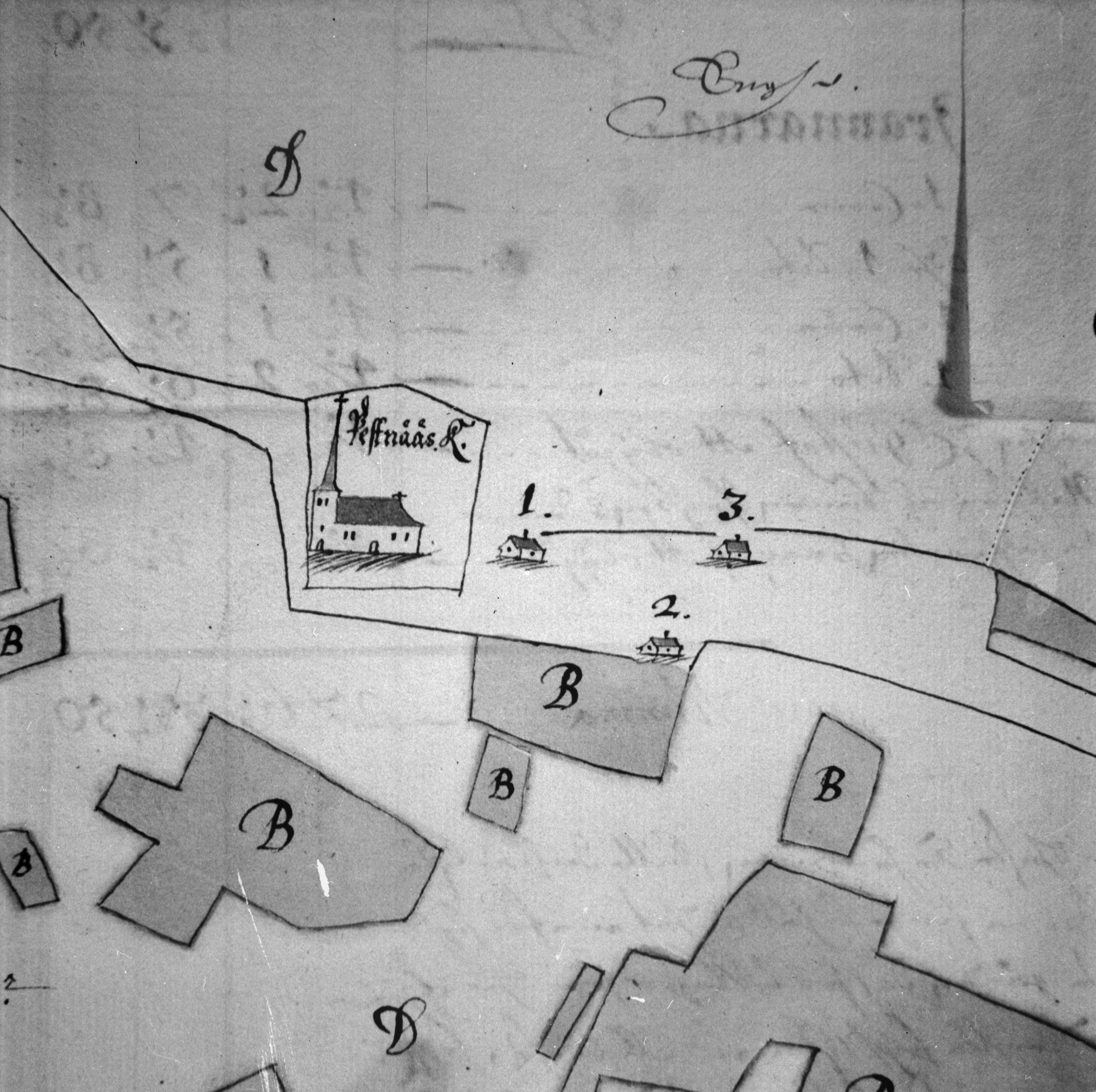 Beskrivning: Teckning av kyrkan från söder, detalj av karta. Ur Geometrisk Book af Ölands Norre mooth 1683. Länsstyrelsen