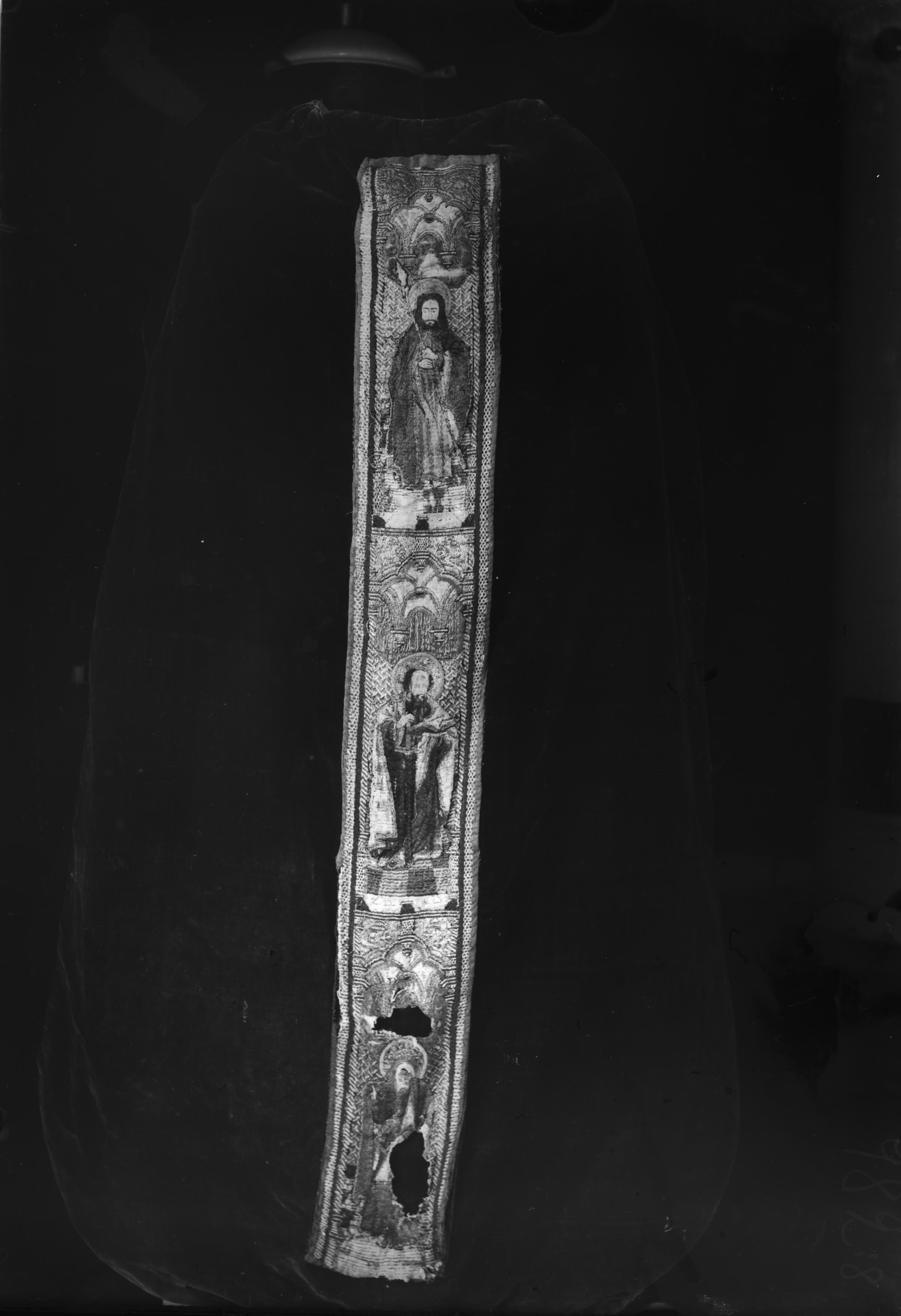 Beskrivning: Mässhake med figurbroderad våd.