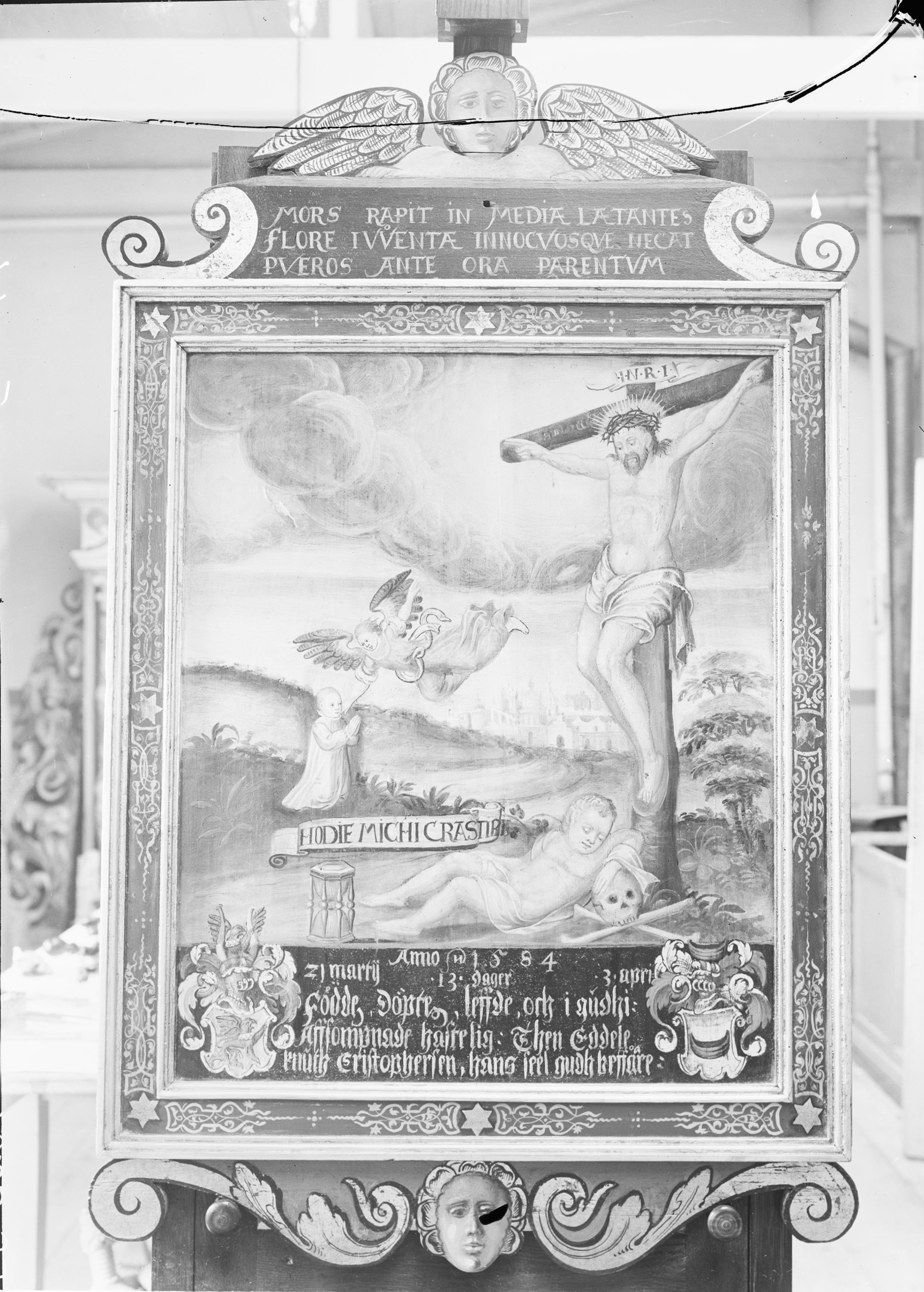 Beskrivning: Epitafium som framställer hur en ängel hämtar upp ett barns själ till himlen inför den korsfäste Kristus. Före konserveringen 1930.