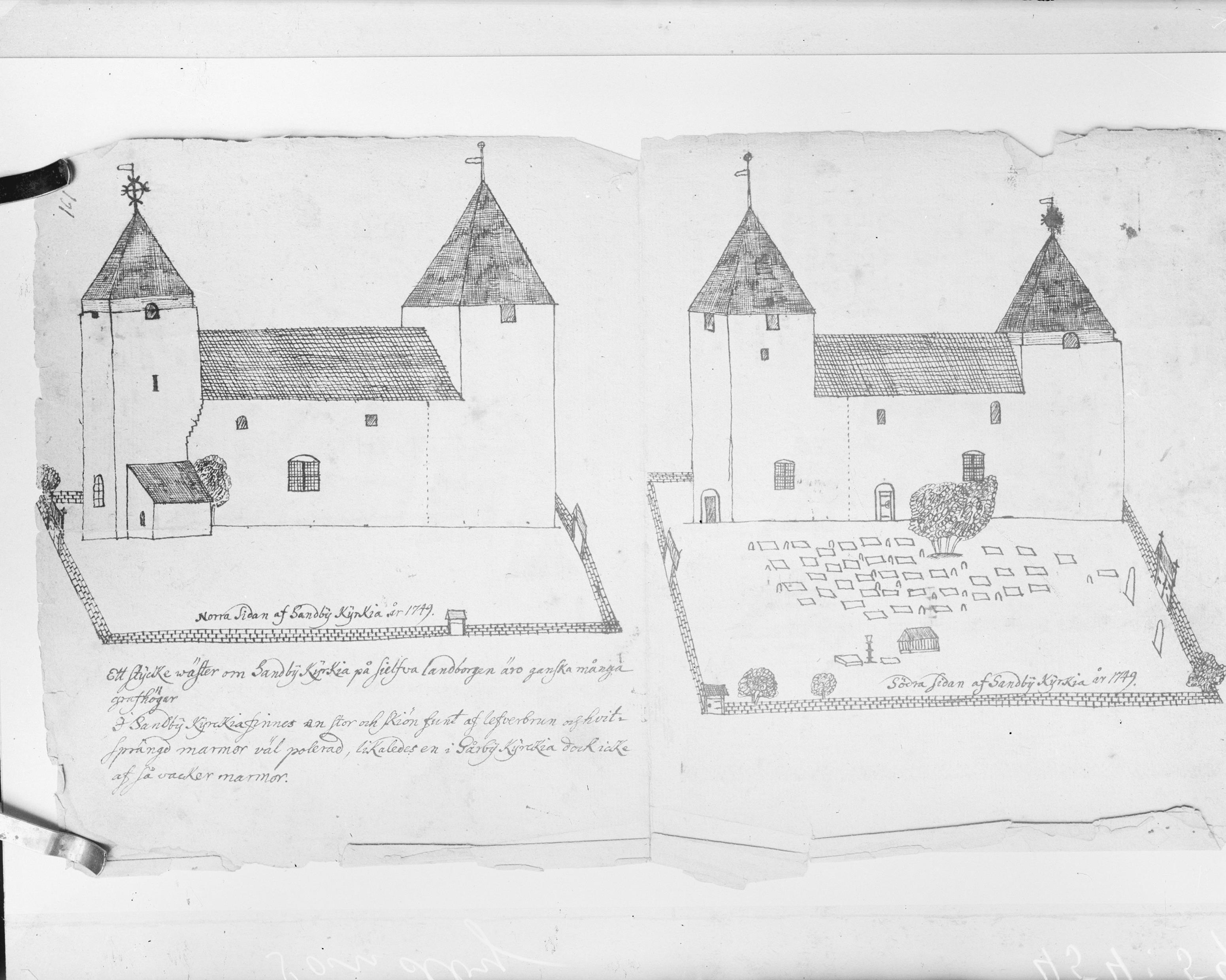 Beskrivning: Teckningar av kyrkan från norr och söder. Ur Frigelius samling. Kalmar högre allmänna läroverks bibliotek.