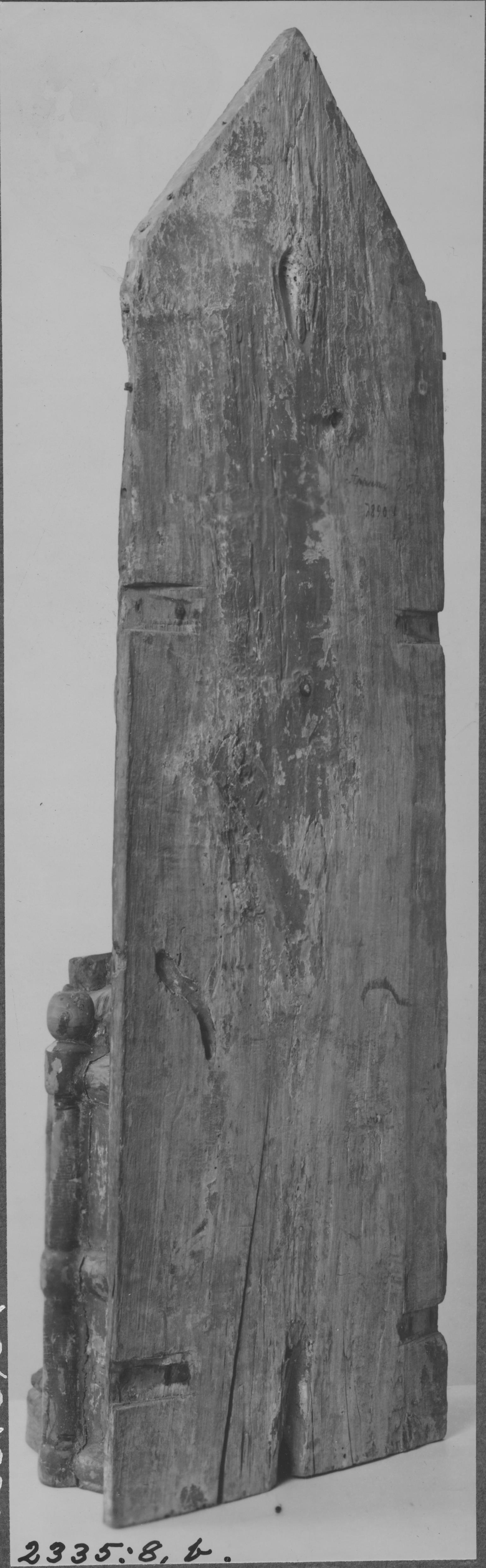 Beskrivning: Träskulptur föreställande Madonnan och barnet, baksida.