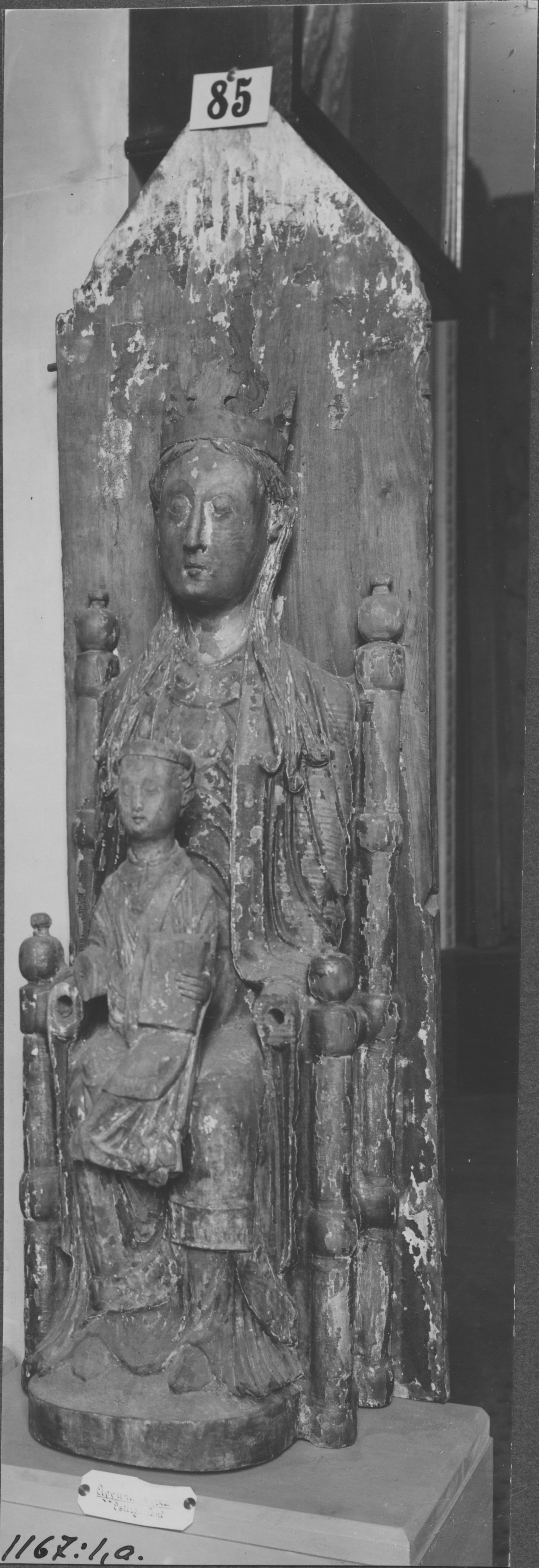 Beskrivning: Träskulptur föreställande Madonnan och barnet.