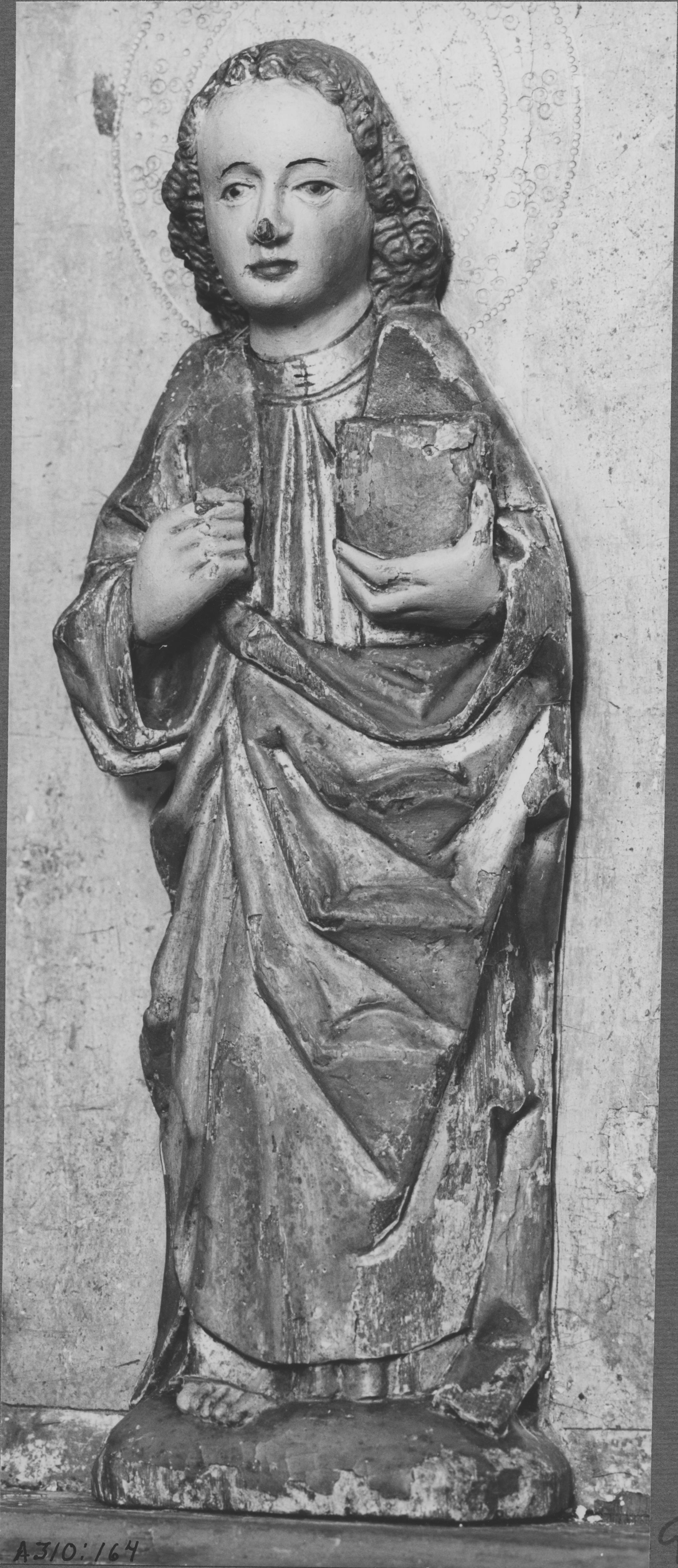 Beskrivning: Detalj av altarskåp, träfigur föreställande en apostel.