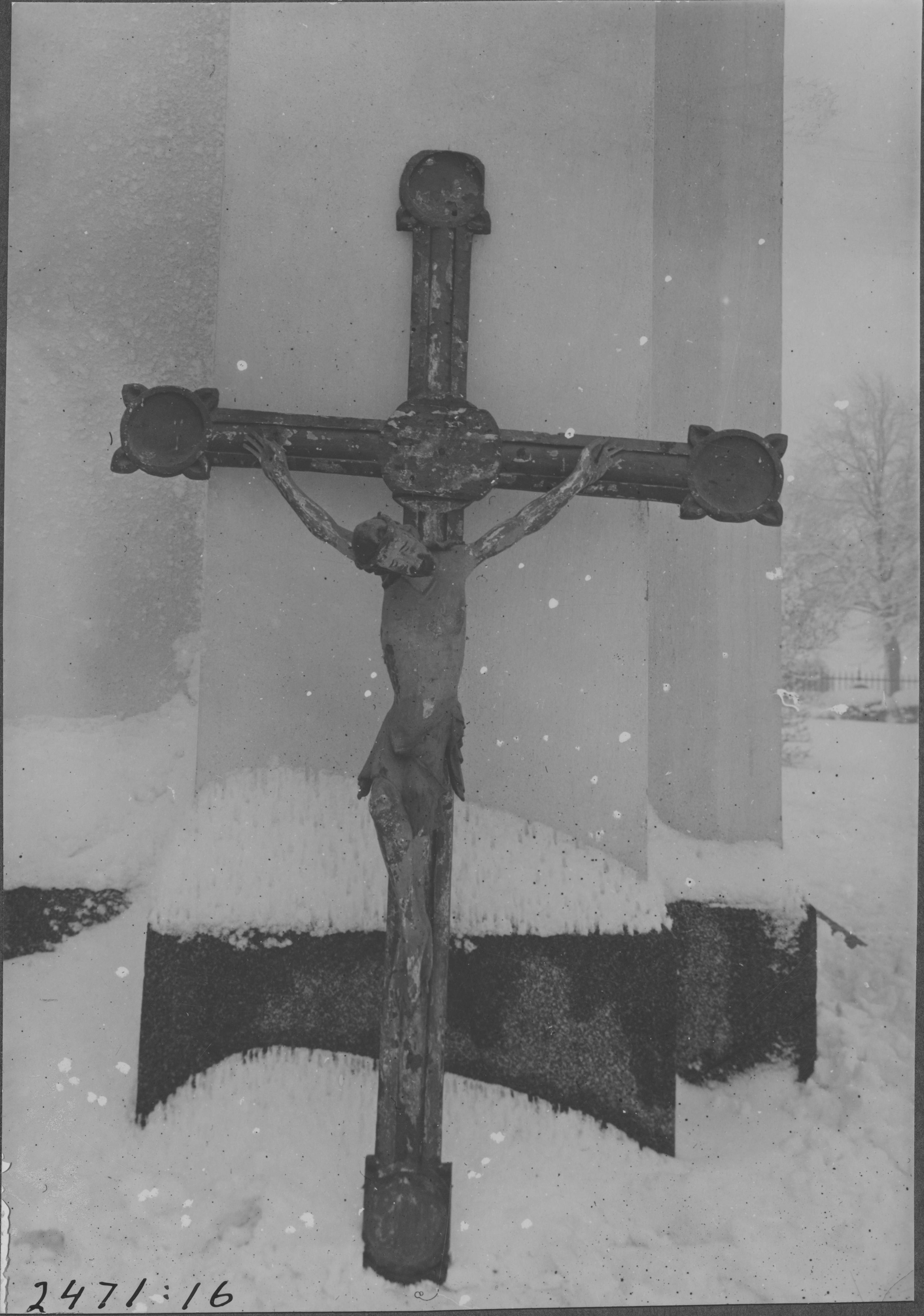 Beskrivning: Krucifix av lövträ från mitten av 1300-talet, uppställt i snön utanför kyrkan.