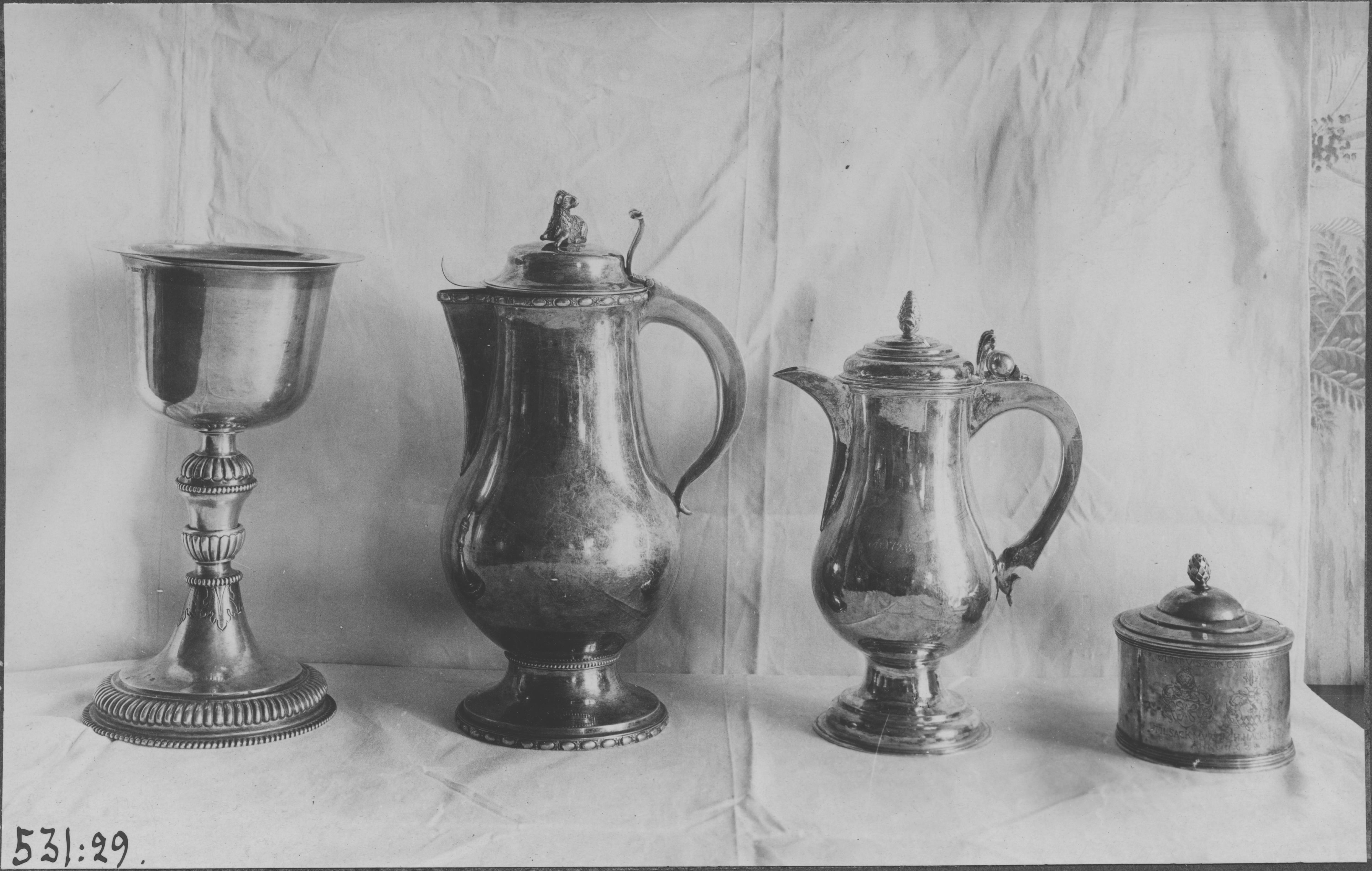 Beskrivning: Kalk med patén, vinkannor och oblatask.