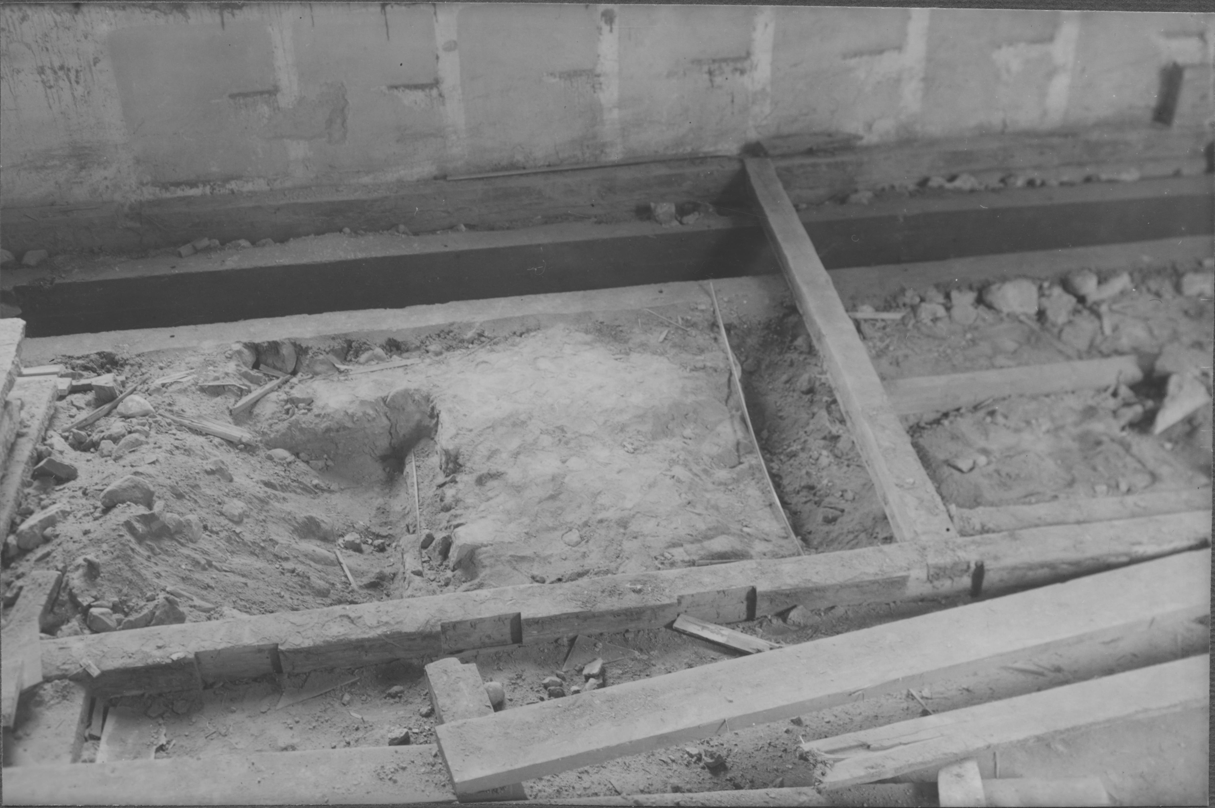 Beskrivning: Utgrävning i kyrkan. Triumfbågsmurens södra del från norr.