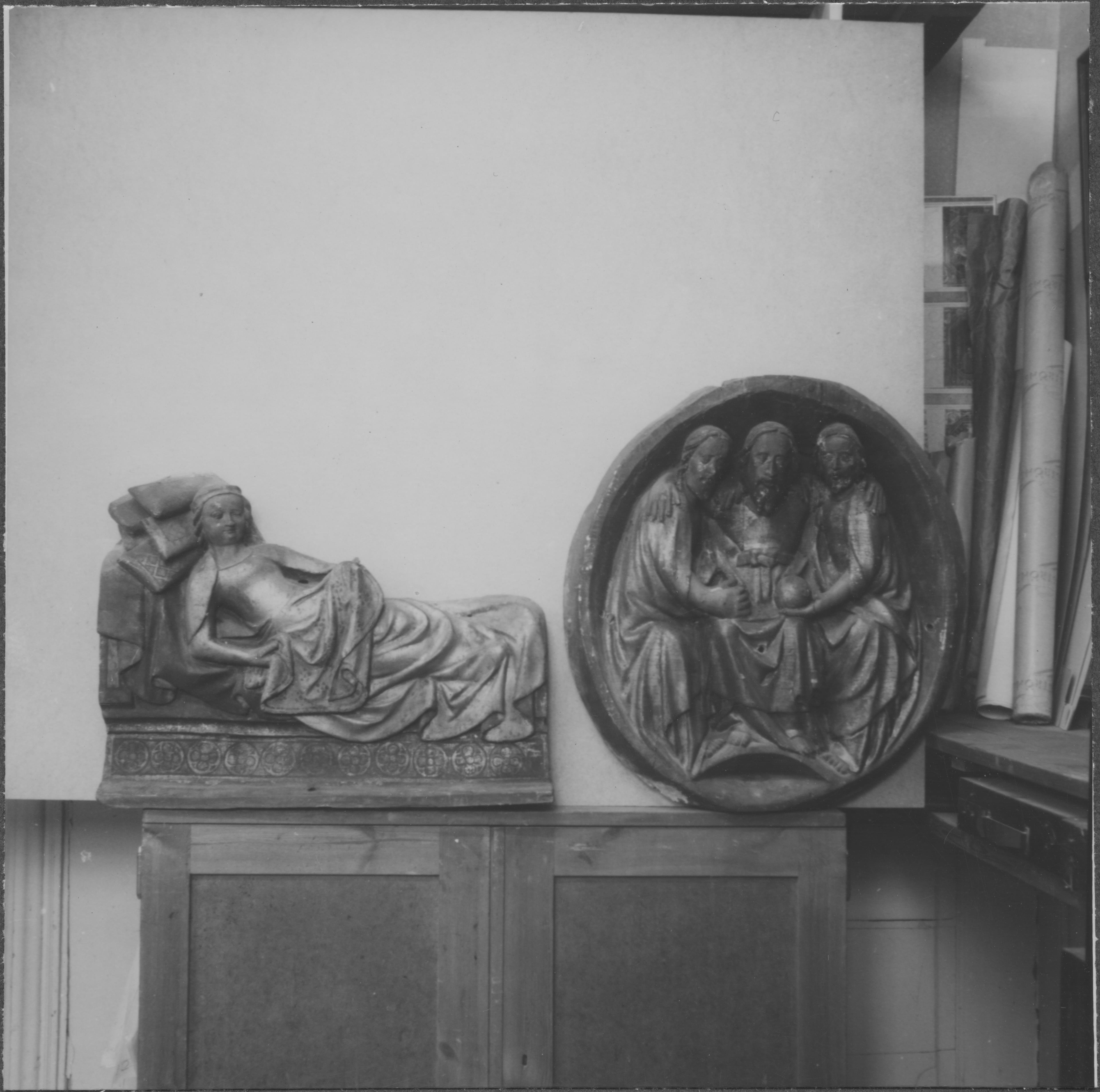 Beskrivning: Figurer från altarskåp, Tre konungars tillbedjan och Treenigheten. Före restaureringen.