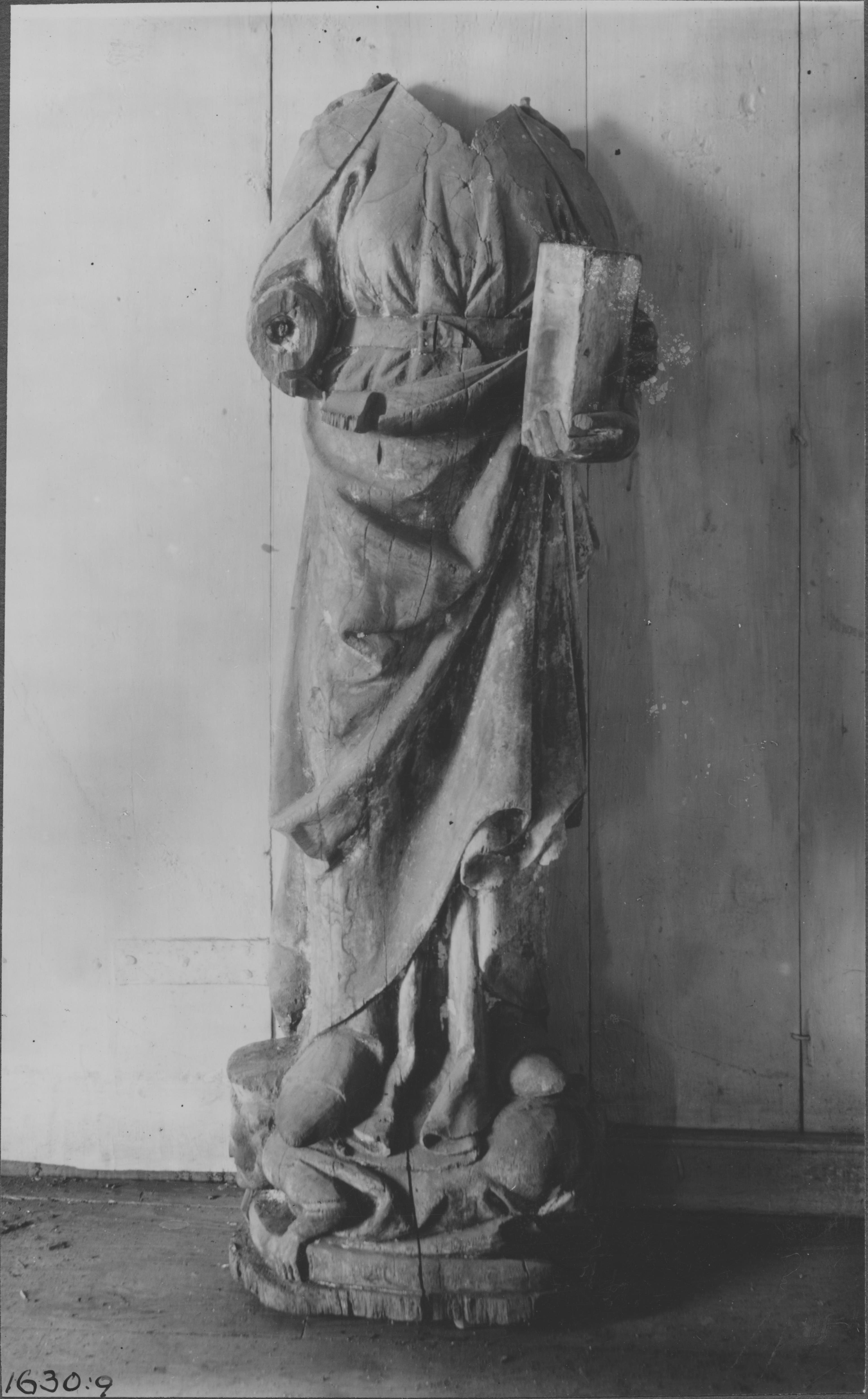 Beskrivning: Kvinnligt helgon; s:t Margareta. Huvudet borta, högra armen borta. Höjd 120 cm. 1400-talets början.