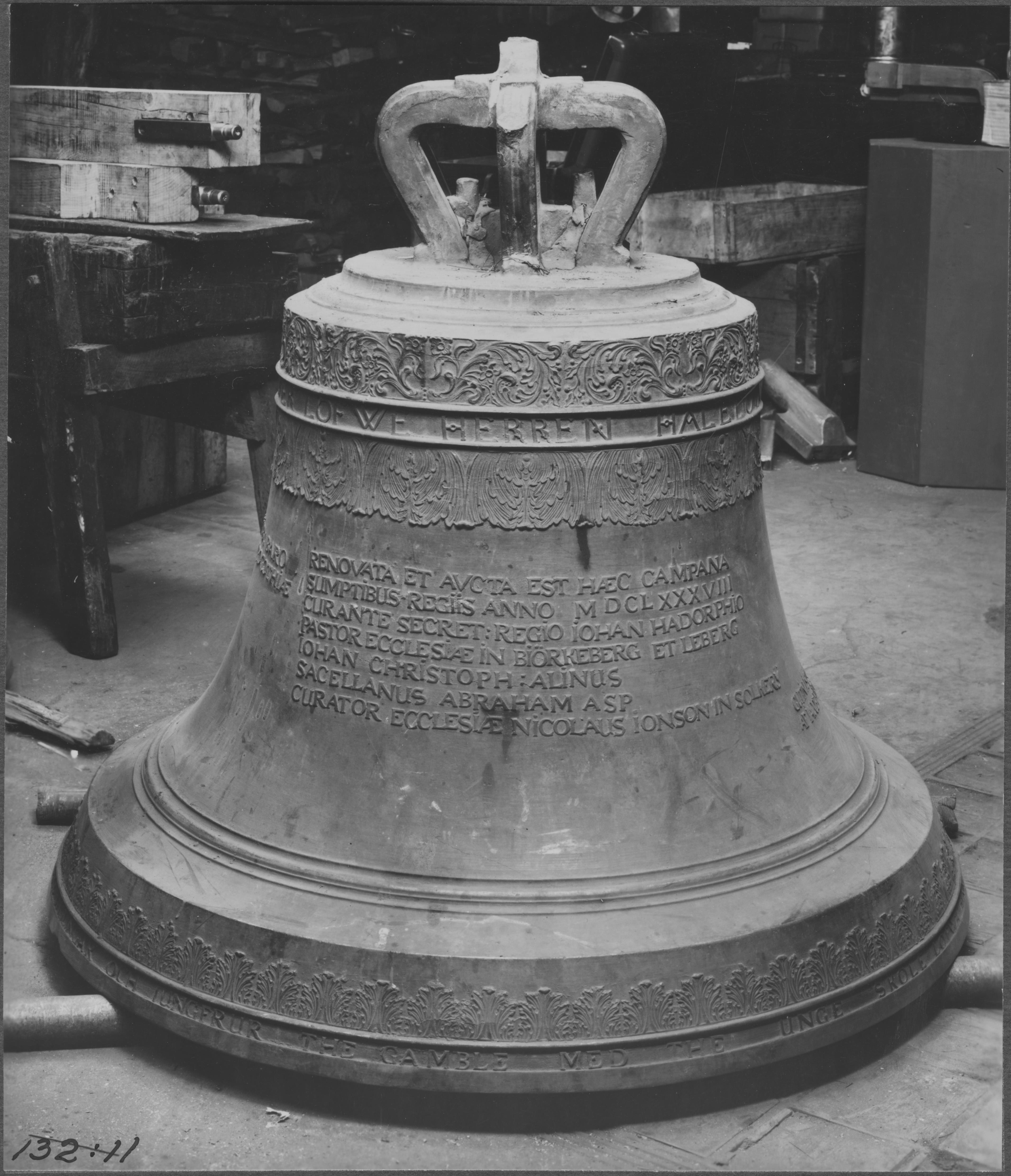 Beskrivning: Storklockan. Gjuten i stockholm 1788. Höjd 95 cm.