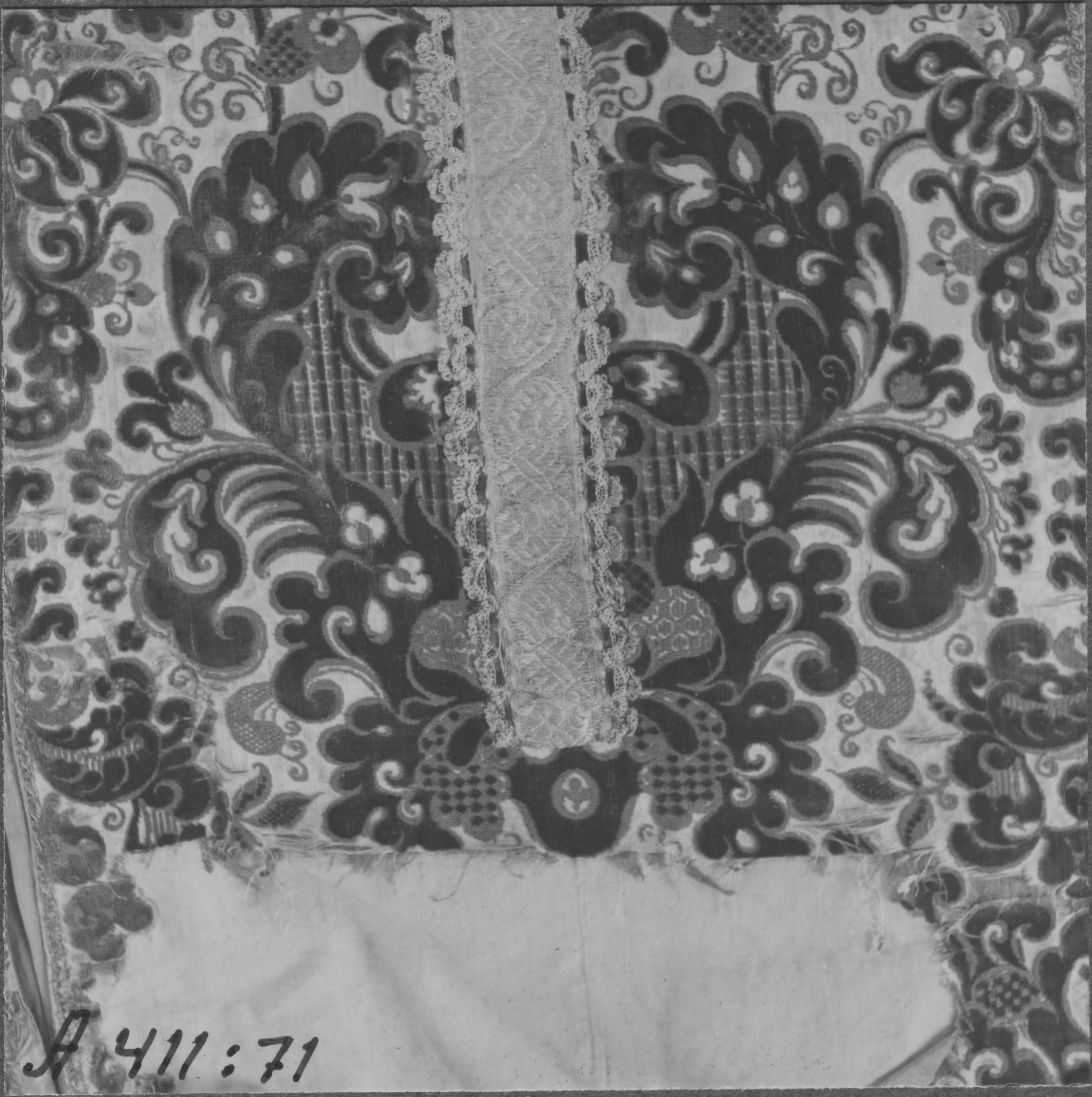Beskrivning: Detalj av mässhake. Röd och vit sammet. Inköpt år 1695.