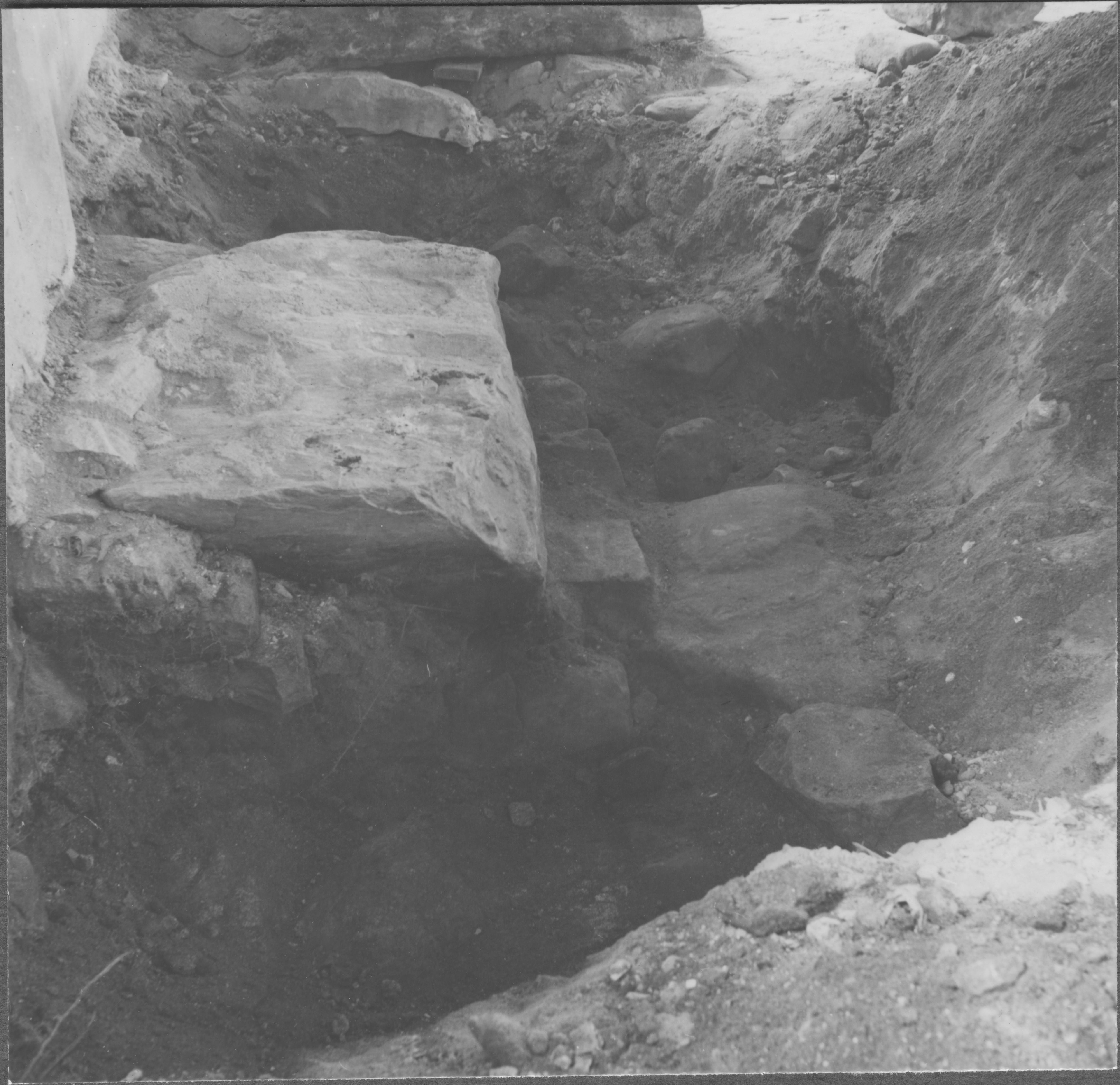 Beskrivning: Pilastergrund omedelbart öster om korportalen samt delar av grundmur till romanska kyrkans kor.