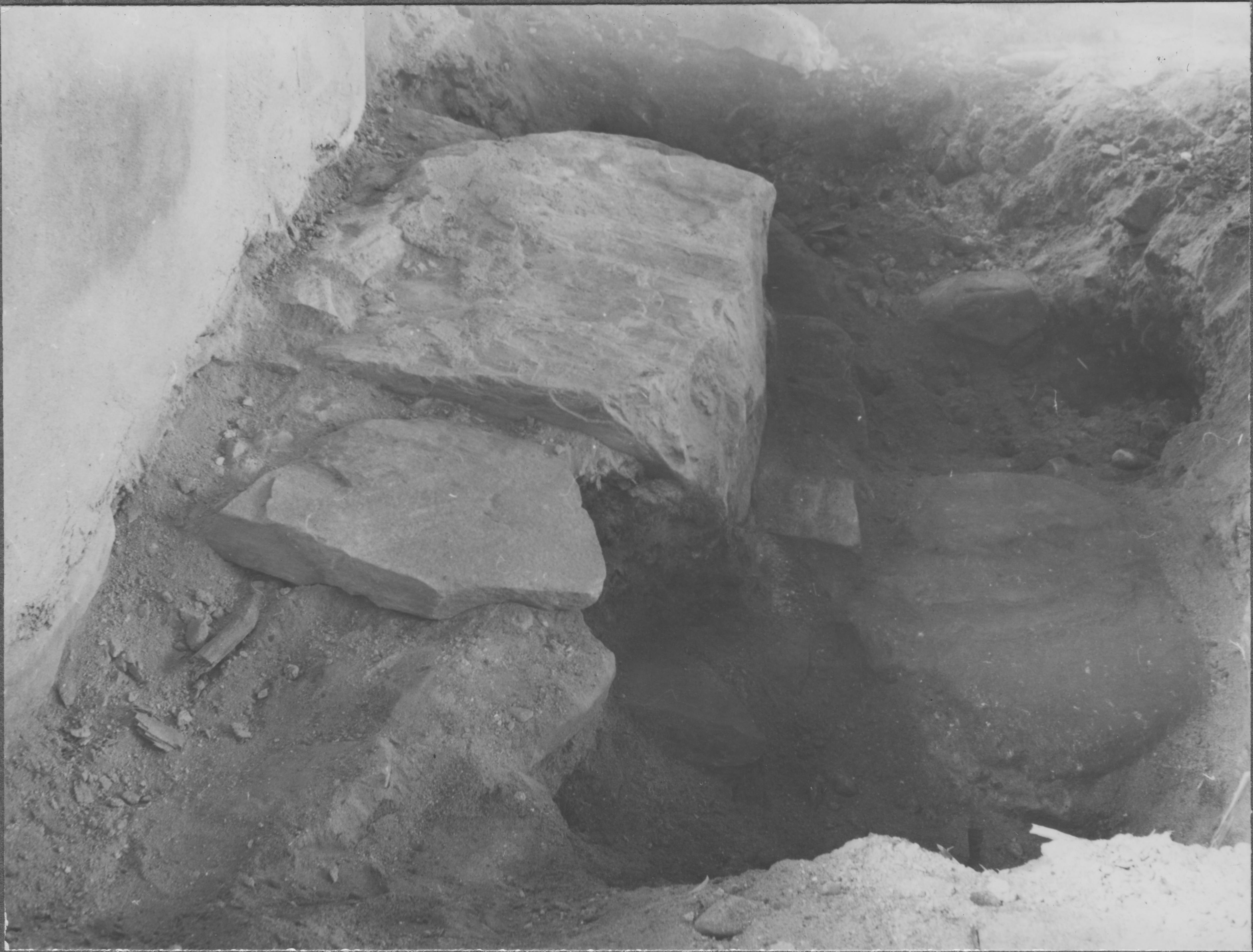 Beskrivning: Beskrivning: Pilastergrund omedelbart öster om korportalen samt delar av grundmur till romanska kyrkans kor.