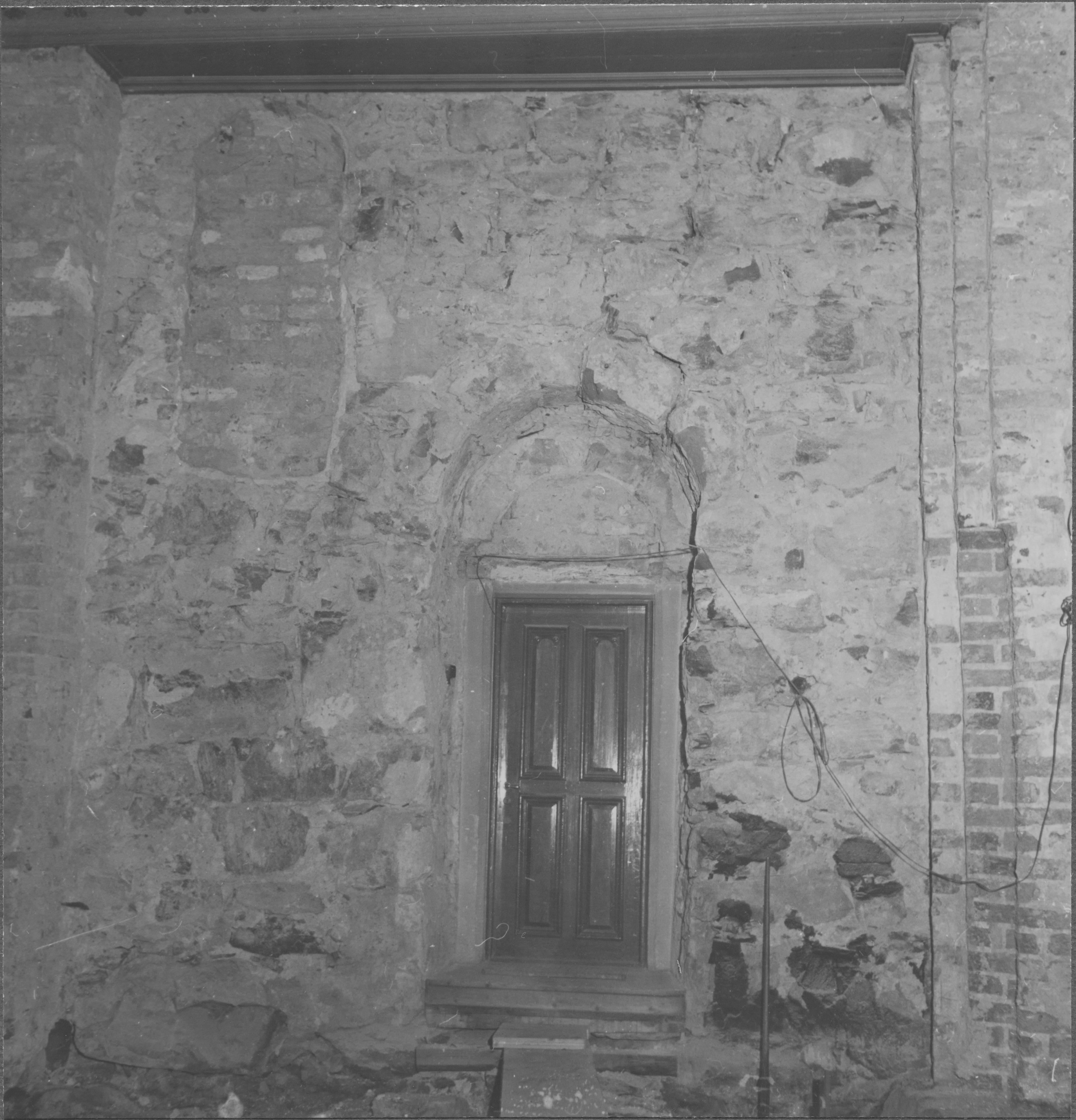 Beskrivning: Långhusets södra mur. Västra travén. Ursprungligen sydportal samt igensatt romanskt fönster.
