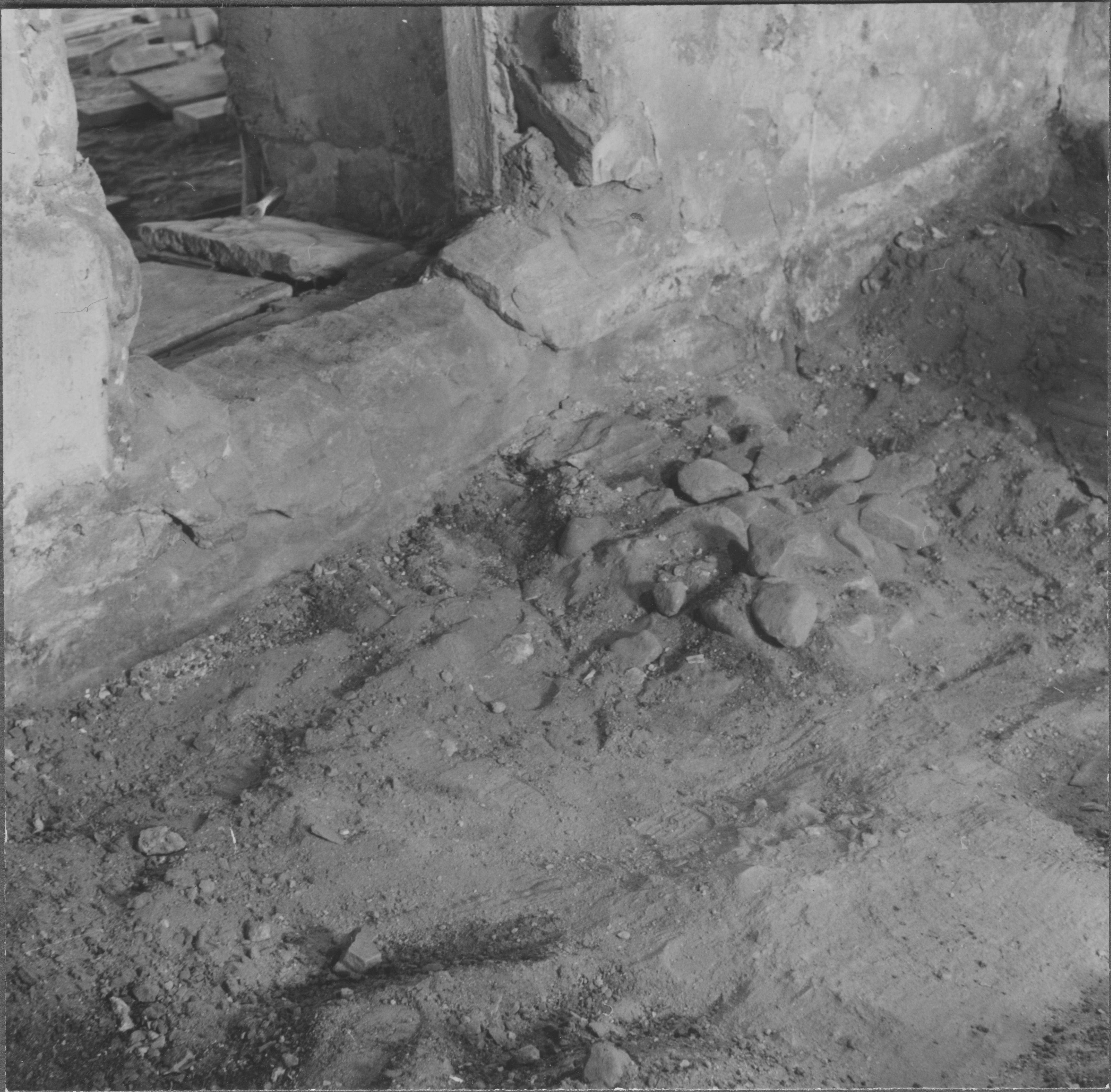 Beskrivning: Vapenhuset (nuvarande sakristia). Kullerstensläggning intill romanaska portalen samt till vänster spår av jordgolv.