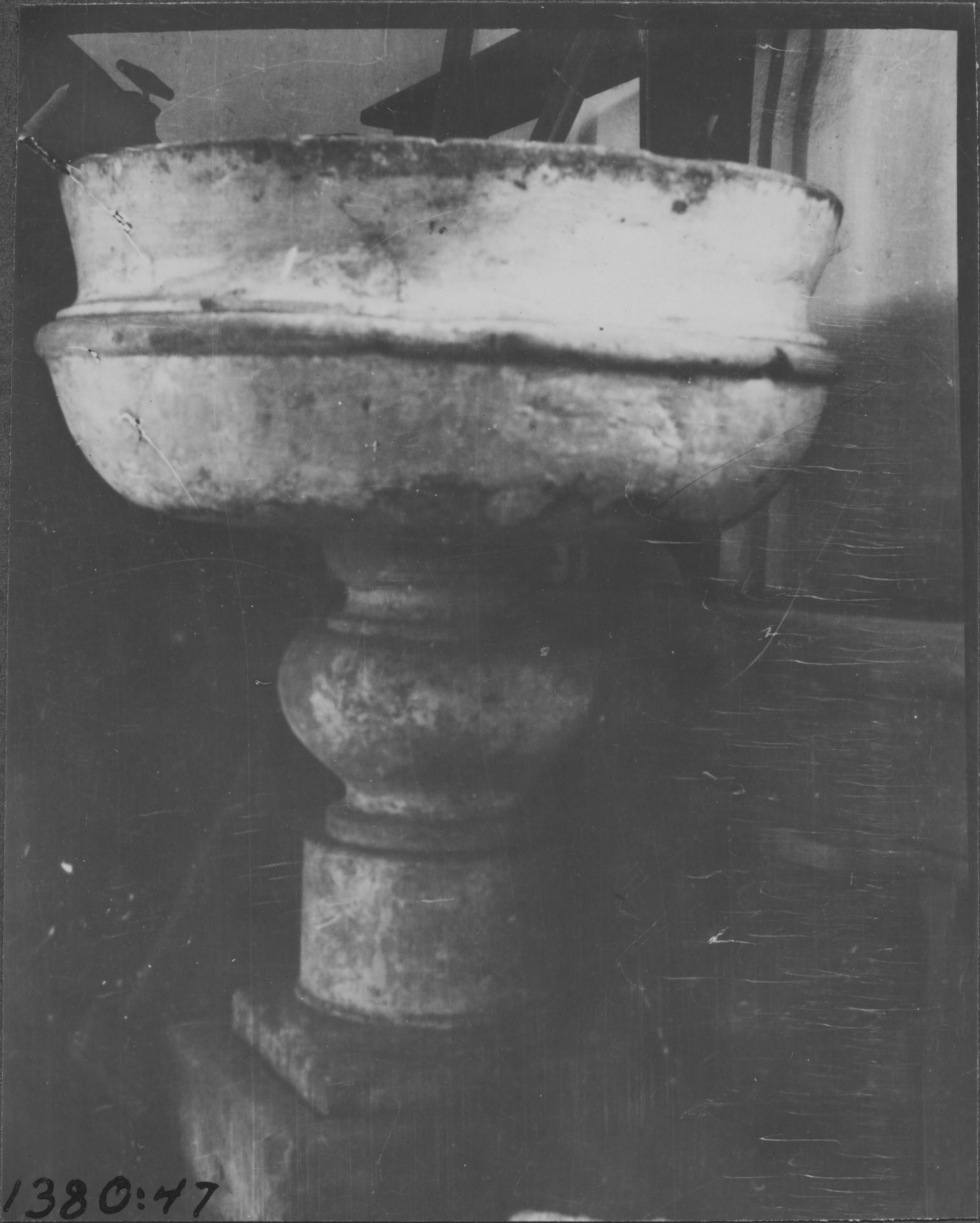 Beskrivning: Dopfunt av dolomit. Målad i vit marmorering. 1600-talet?