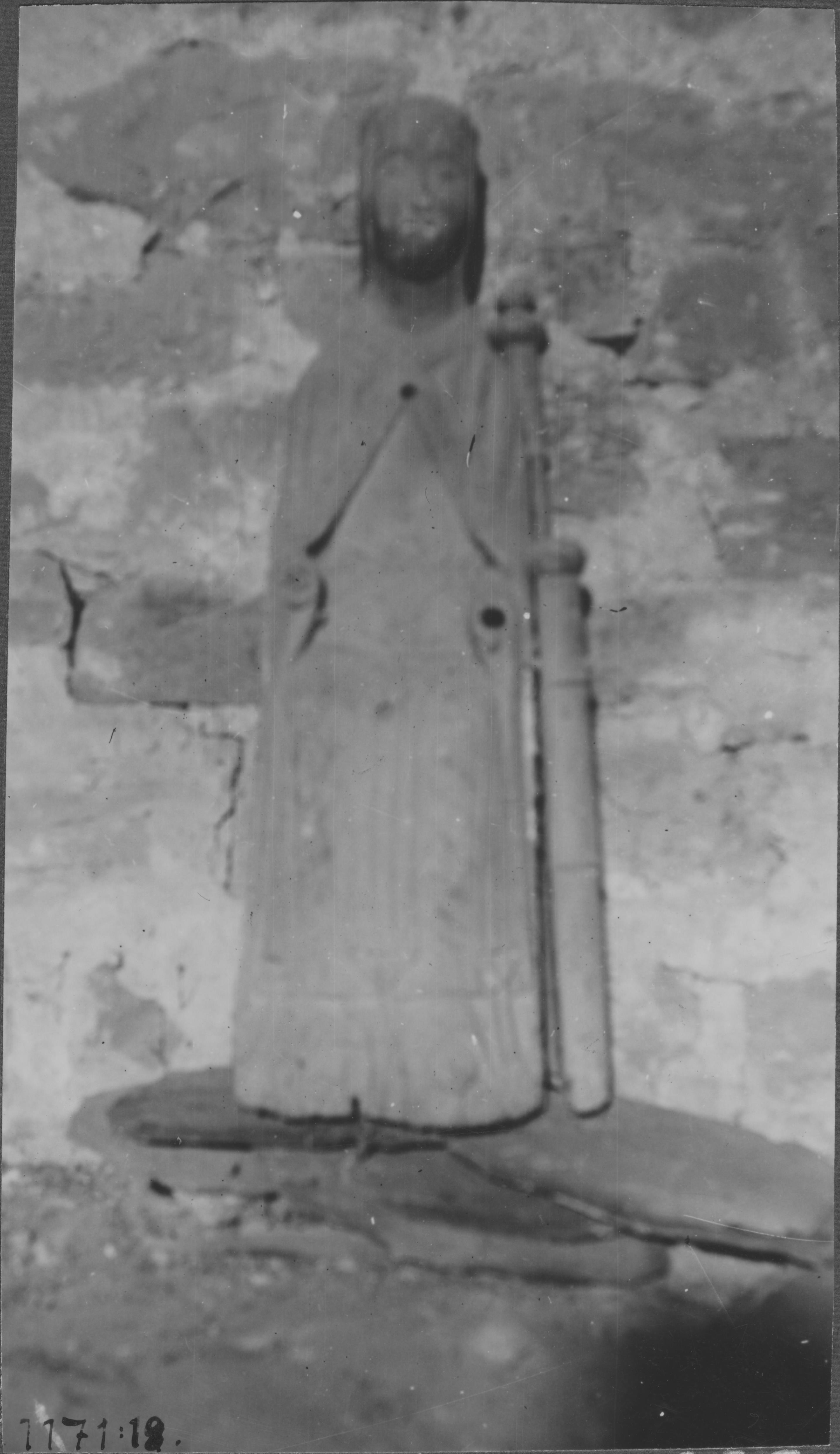 Beskrivning: Madonnabild av trä; Maria sittande på stol med höga snidade stolpar. Från omkring 1200.