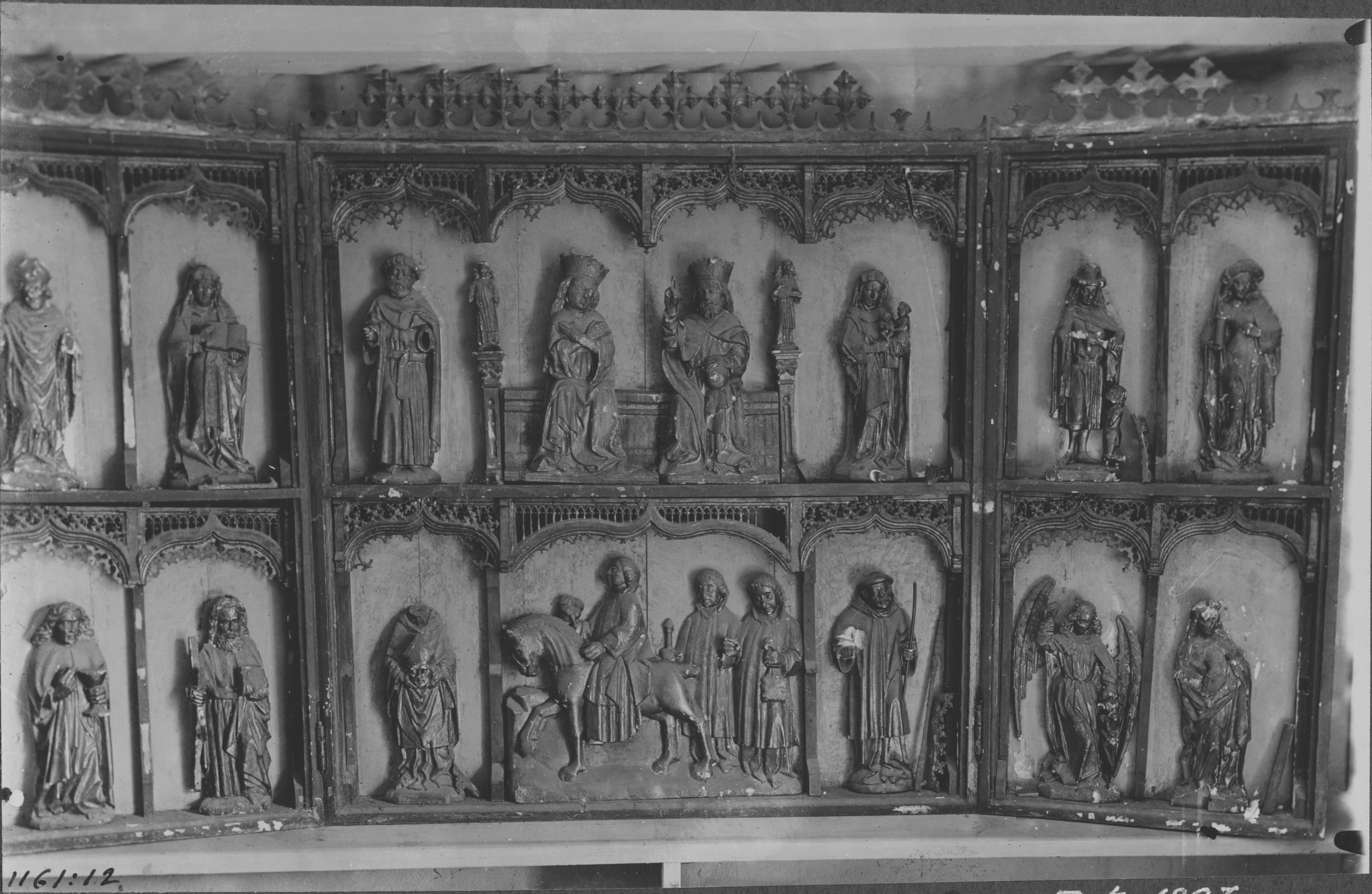 Beskrivning: Altarskåp av trä med snidade figurer. Figurerna och masverket bronserade. Lübeckerarbete, 1400-talet.