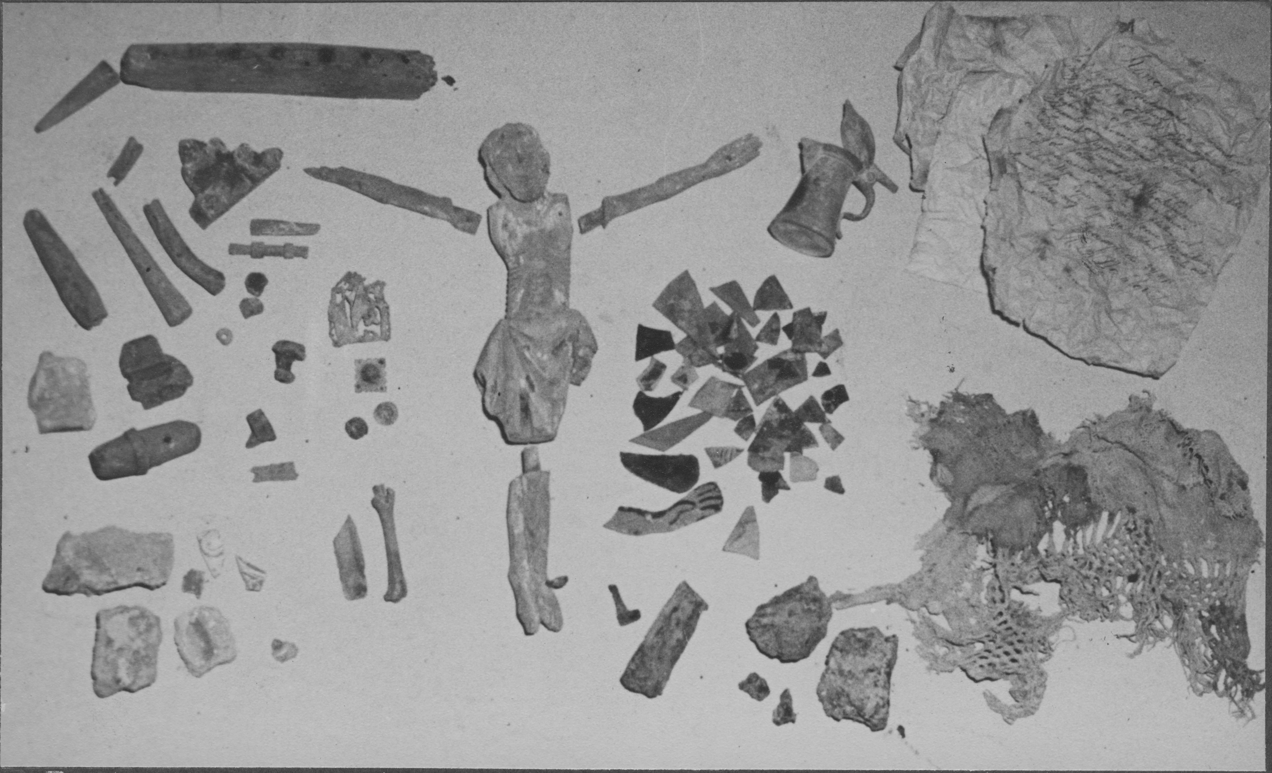 Beskrivning: Fynd från fyllningen bakom altarbordet.
