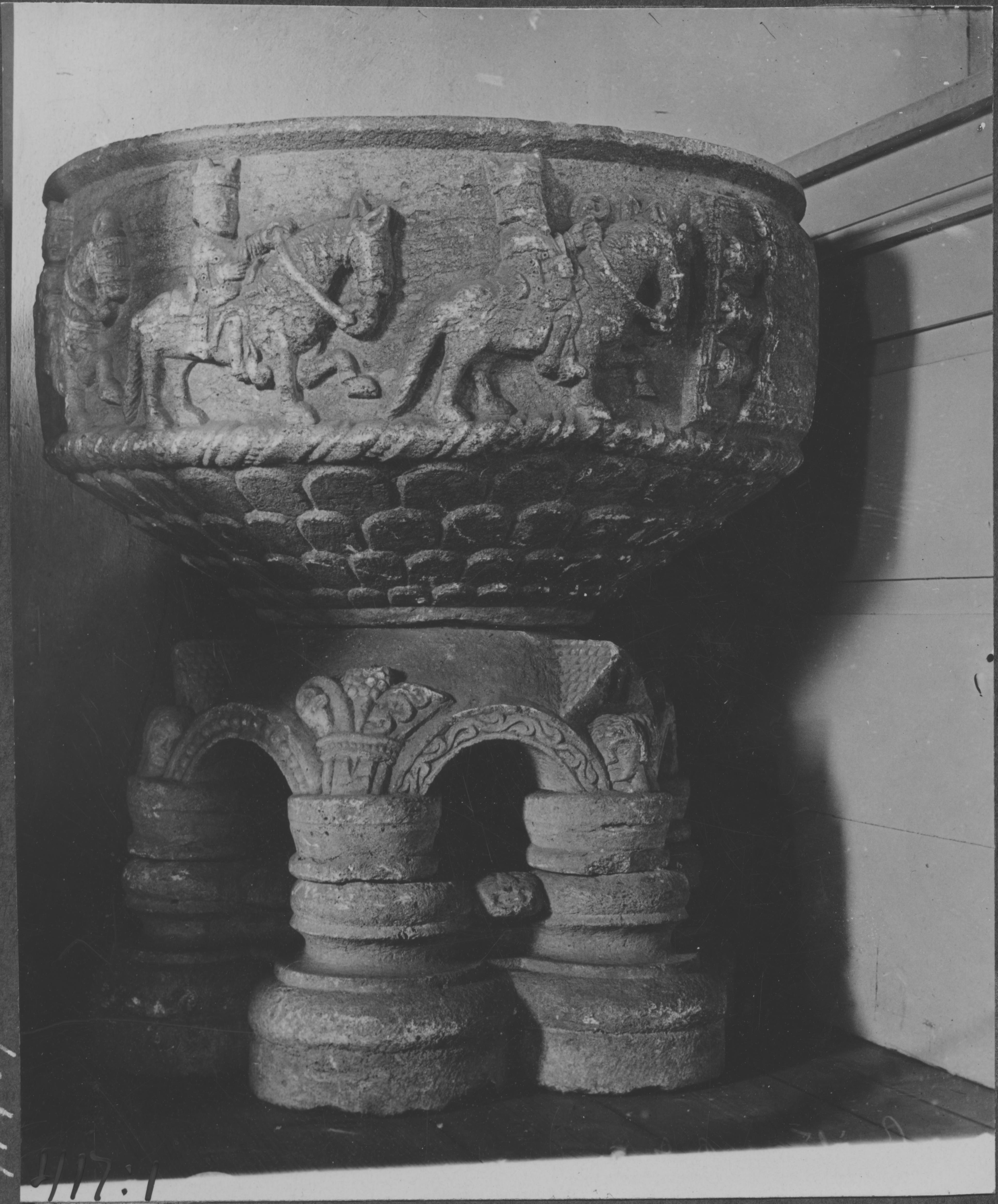 Beskrivning: Dopfunt av sandsten. Prydd med reliefframställningar av Jesu födelse och de tre konungarnas tillbedjan. från 1100-talet.