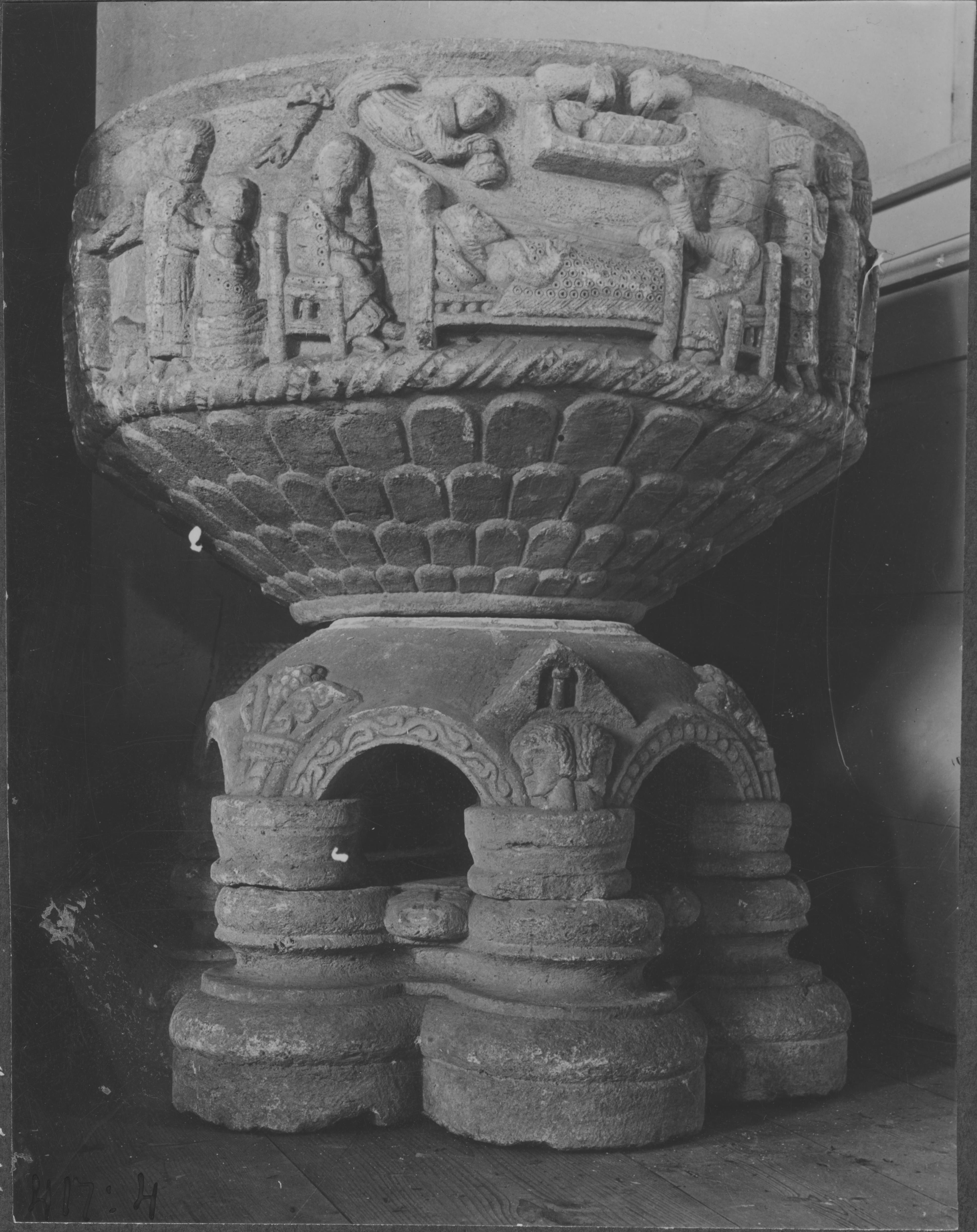 Beskrivning: Beskrivning: Dopfunt av sandsten. Prydd med reliefframställningar av Jesu födelse och de tre konungarnas tillbedjan. från 1100-talet.