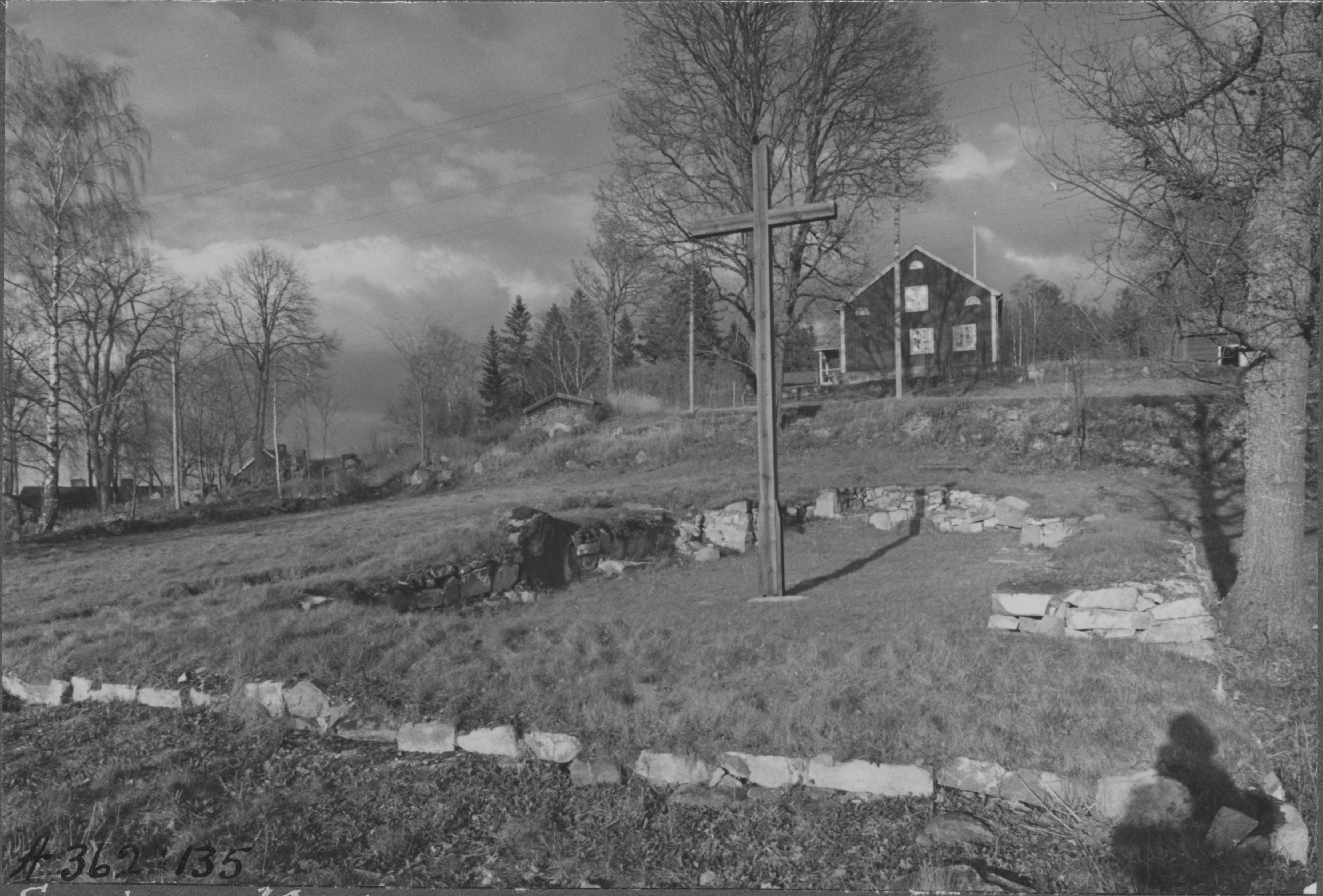 Beskrivning: Grundmurar till en gamla kyrkan efter utgrävning 1953-1954.