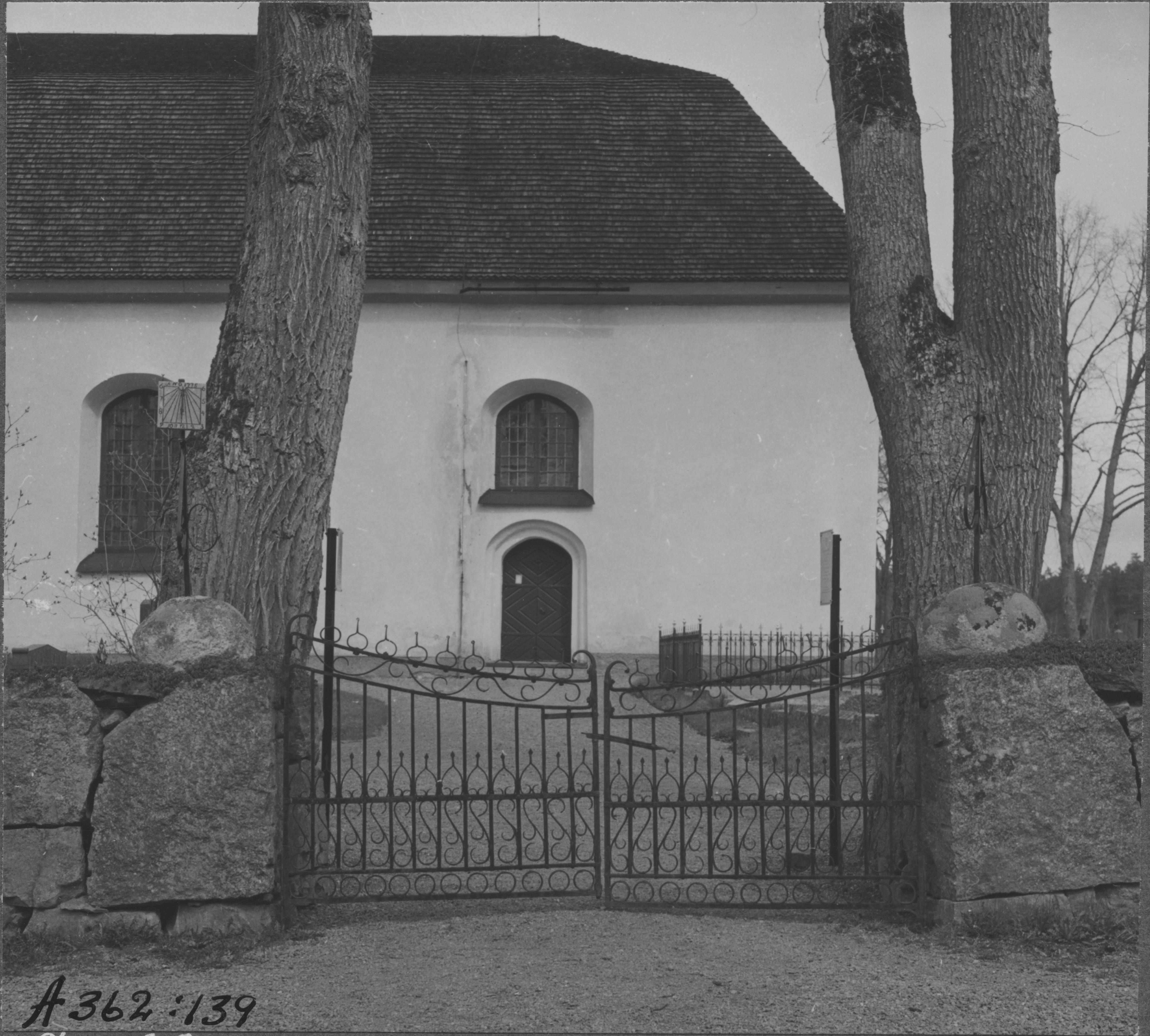 Beskrivning: Södra kyrkogårdsingången med timsten från 1776 och grindar från 1815. Sveriges Kyrkor.
