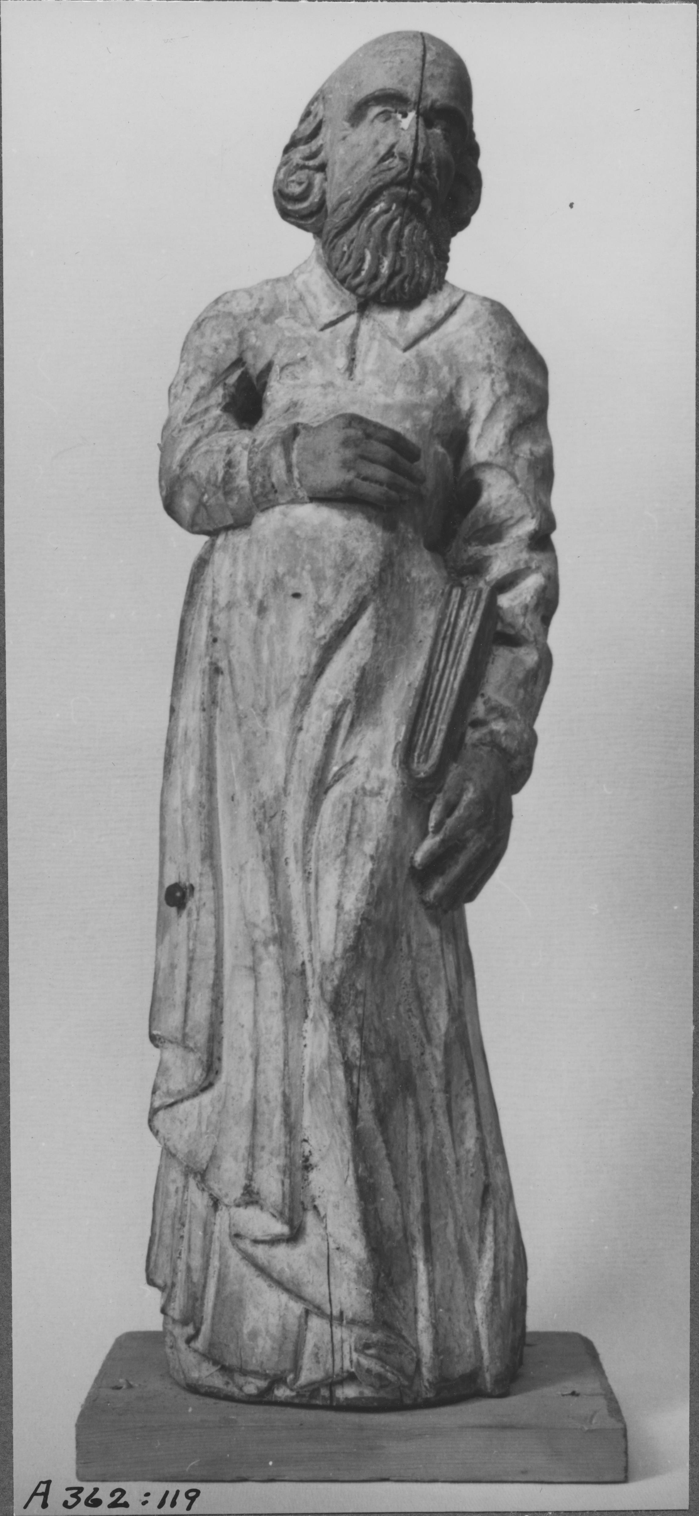 Beskrivning: Träskulptur föreställande evangelist. Från en äldre predikstol (1600-talets senare hälft?) uppsatt i gamla kyrkan på 1720-talet. Sveriges Kyrkor.