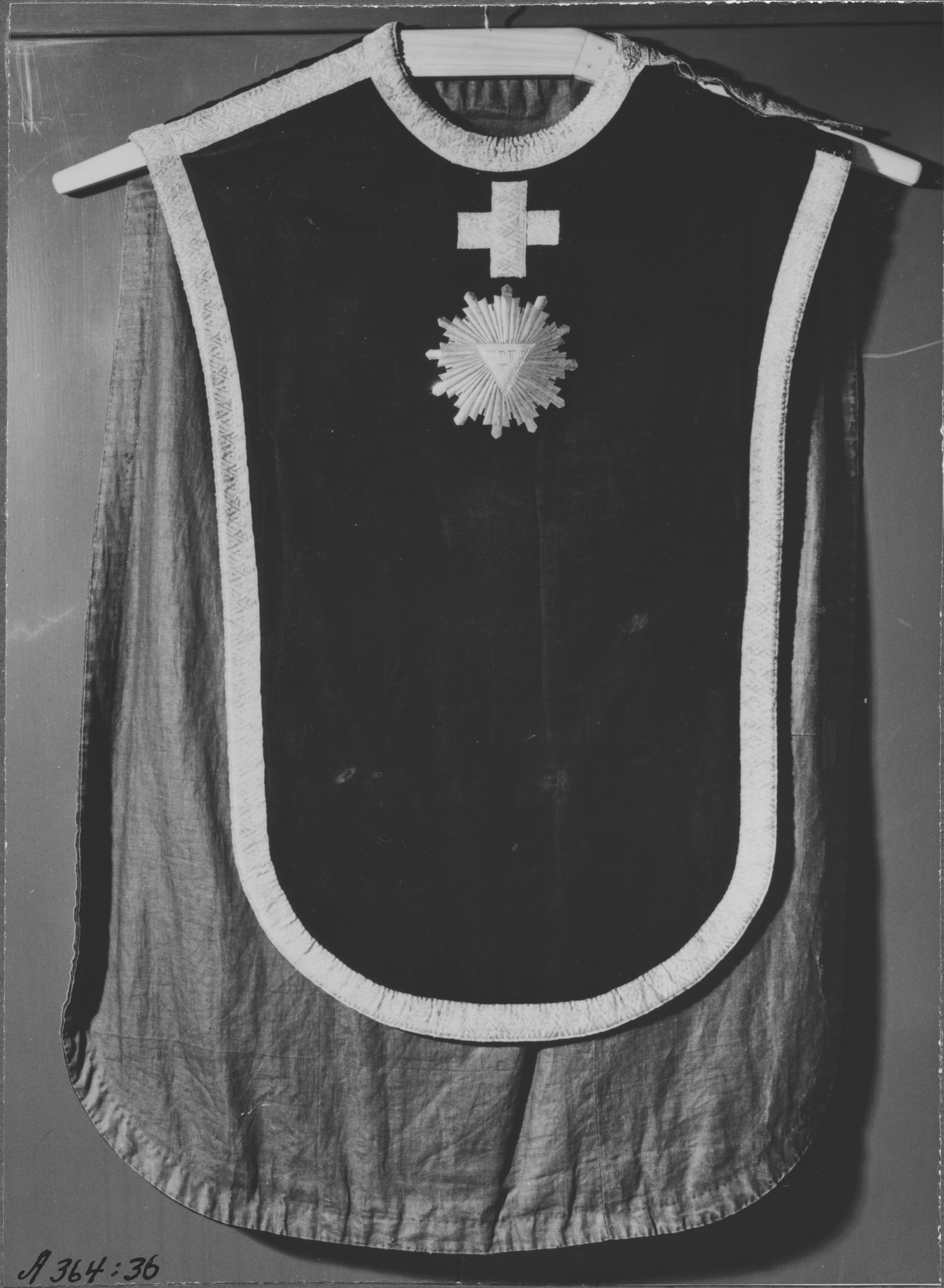Beskrivning: Framstycket på mässhake av svart sammet med galon, kors och gudsöga i silver. Från 1786. Sveriges Kyrkor.