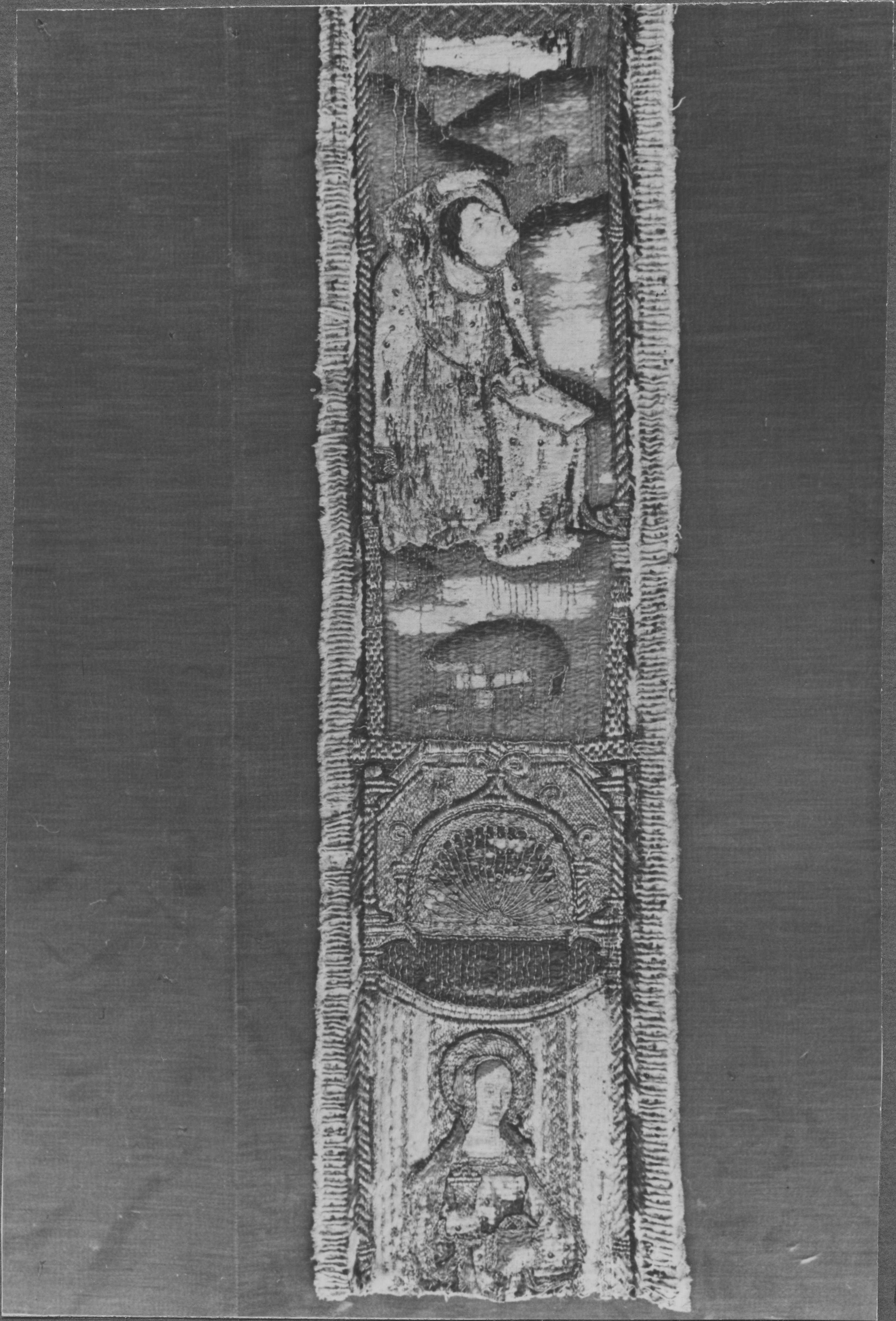 Beskrivning: Broderat kors från mässhake, detalj. Flandriskt arbete fån senmedeltiden.