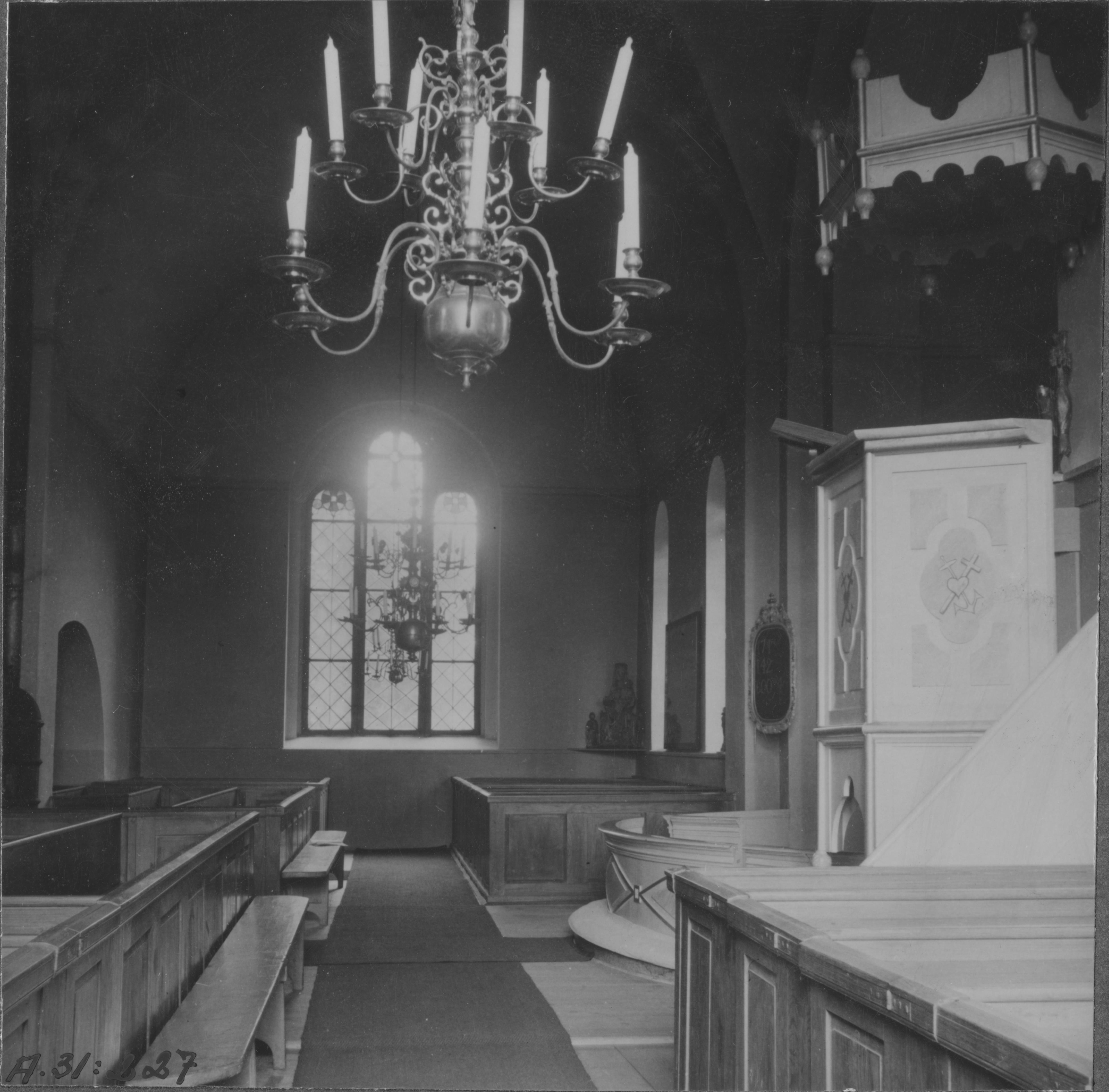 Beskrivning: Kyrkbänkar del av altarring etc.