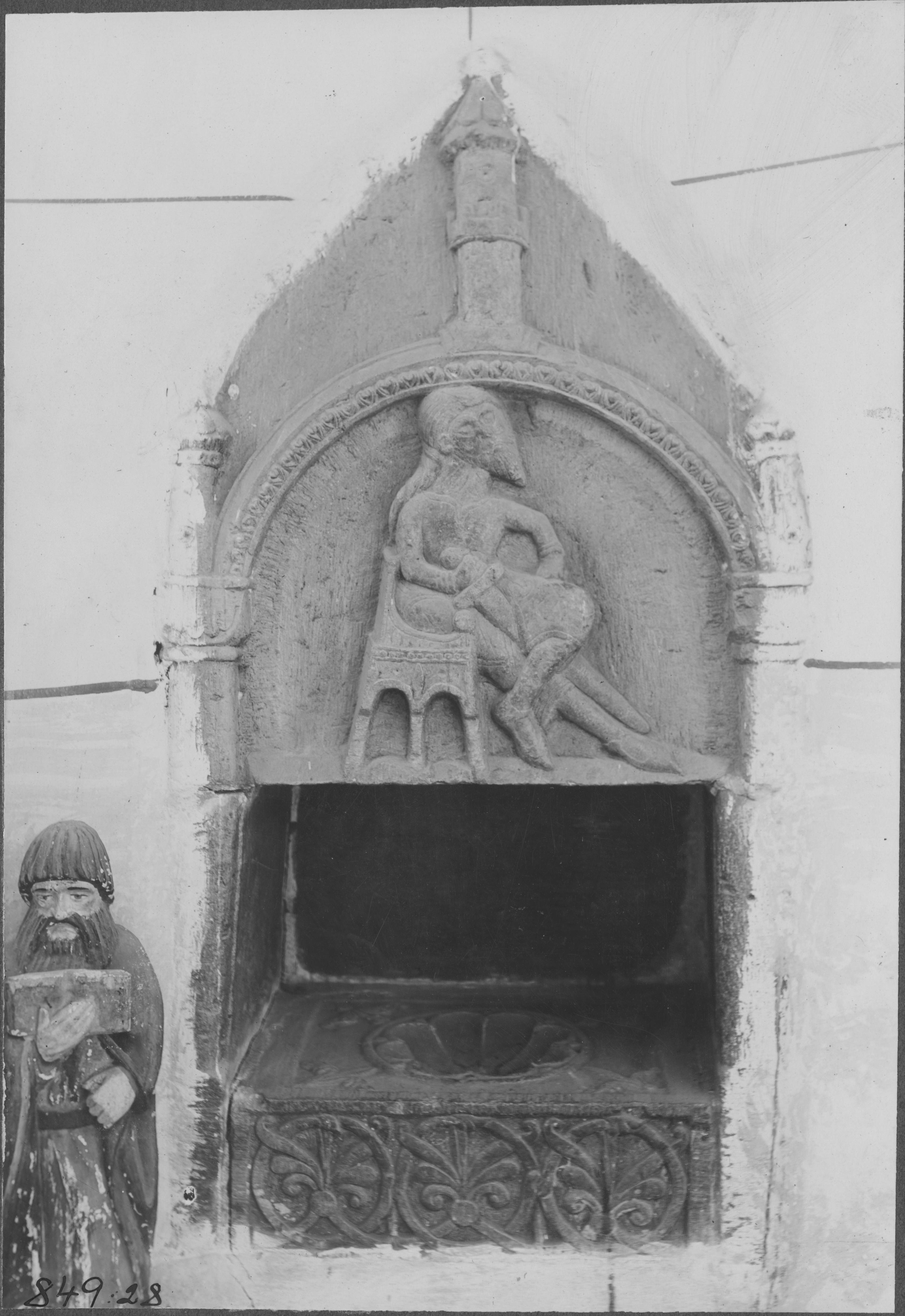 Beskrivning: Piscina i vapenhusets södra hörn. Från 1200-talet. Över piscinan finns en relief visande en elegant riddare från 1100-talet.