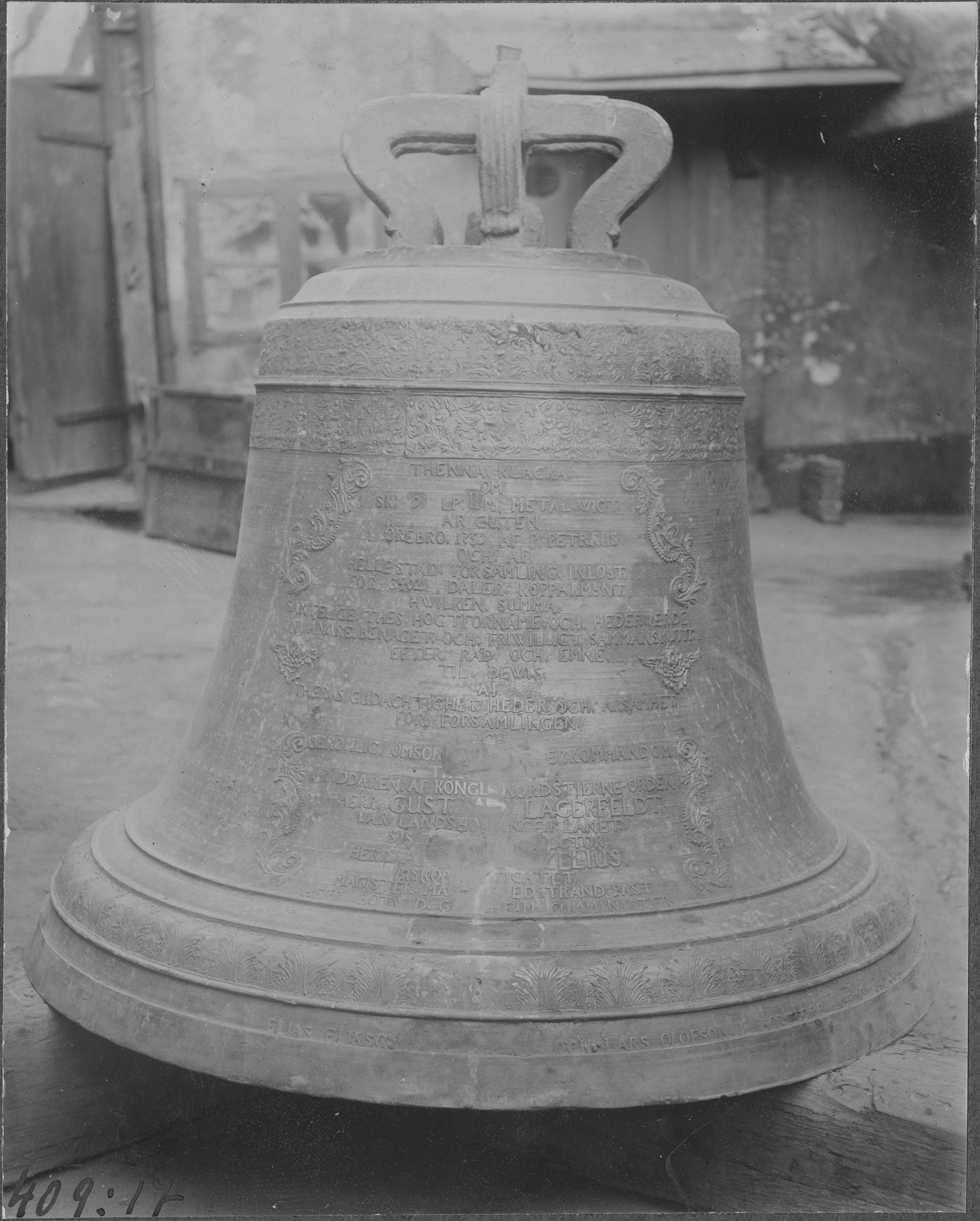Beskrivning: Storklockan. Enligt inskrift omgjuten 1767. Ornerad med Kristus som världsdomare, Paulus, Petrus och evangelister. Vikt 1182 kg. Diameter 130 cm, höjd 132 cm.
