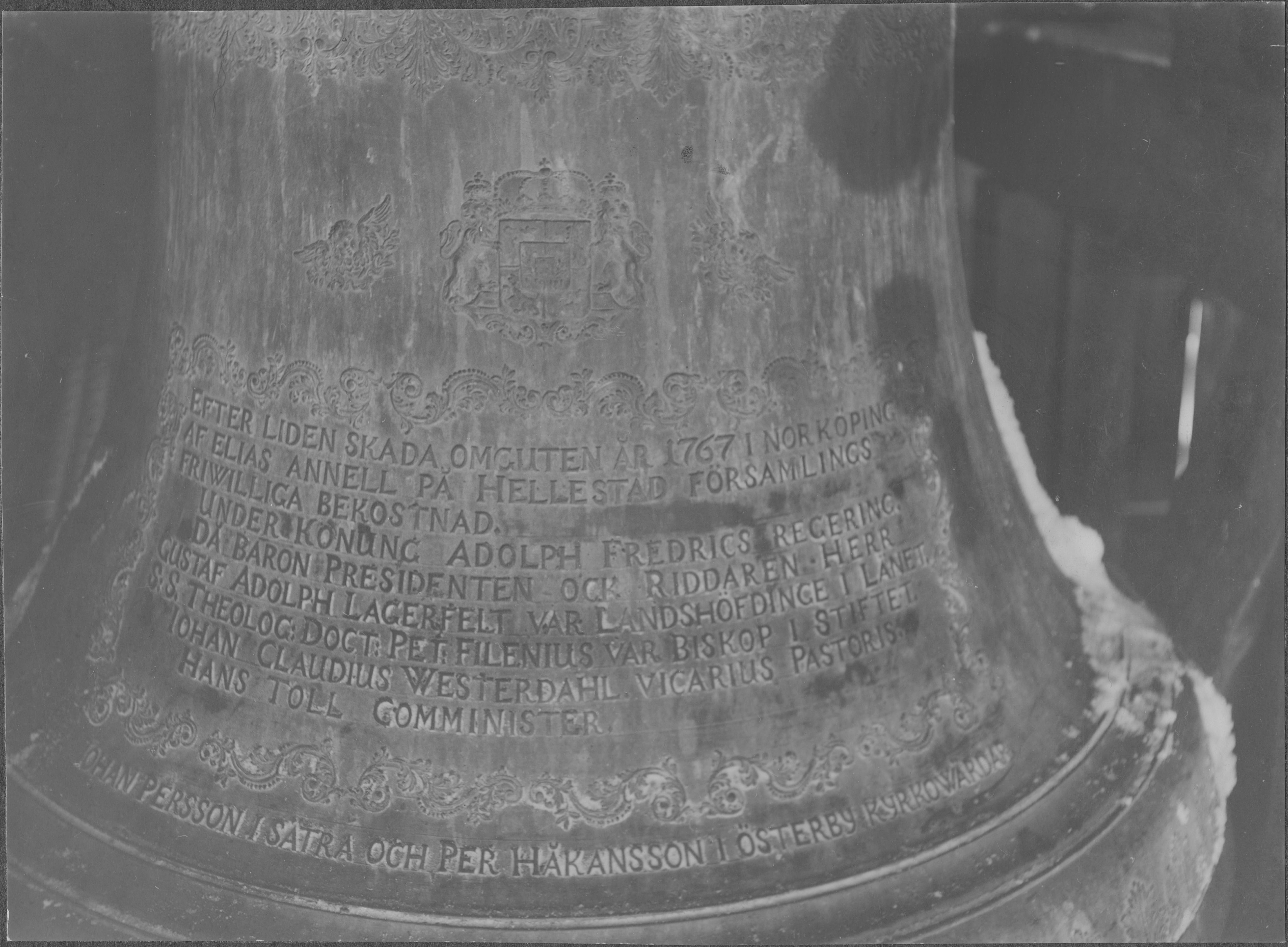 Beskrivning: Storklockan. Enligt inskrift omgjuten 1767. Ornerad med Kristus som världsdomare, Paulus, Petrus och evangelister. Vikt 1182 kg. Diameter 130 cm, höjd 132 cm. Före omgjutningen 1927.
