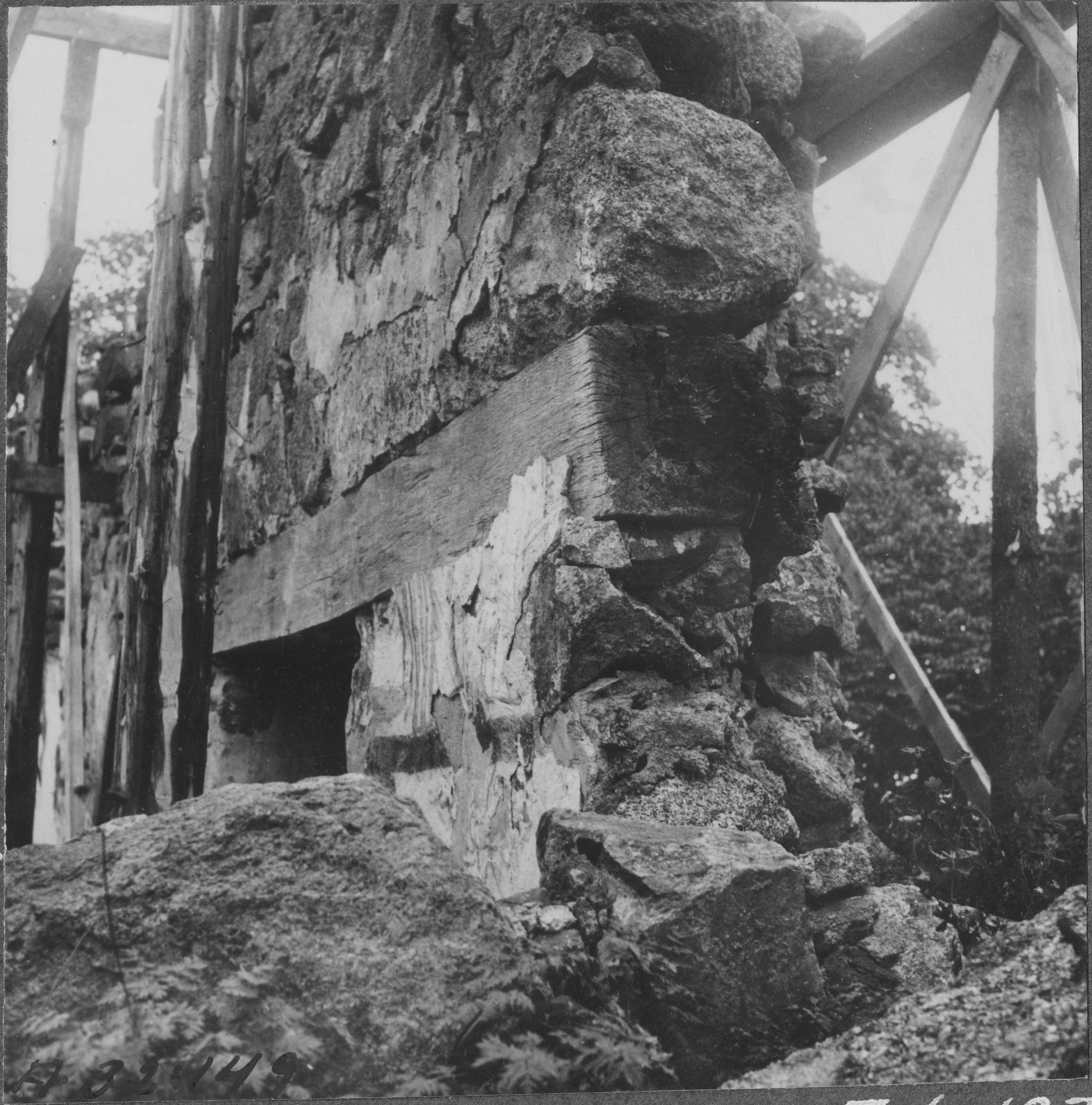 Beskrivning: Södra muren, partiet över den ursprungliga portalen. Från västra gaveln.