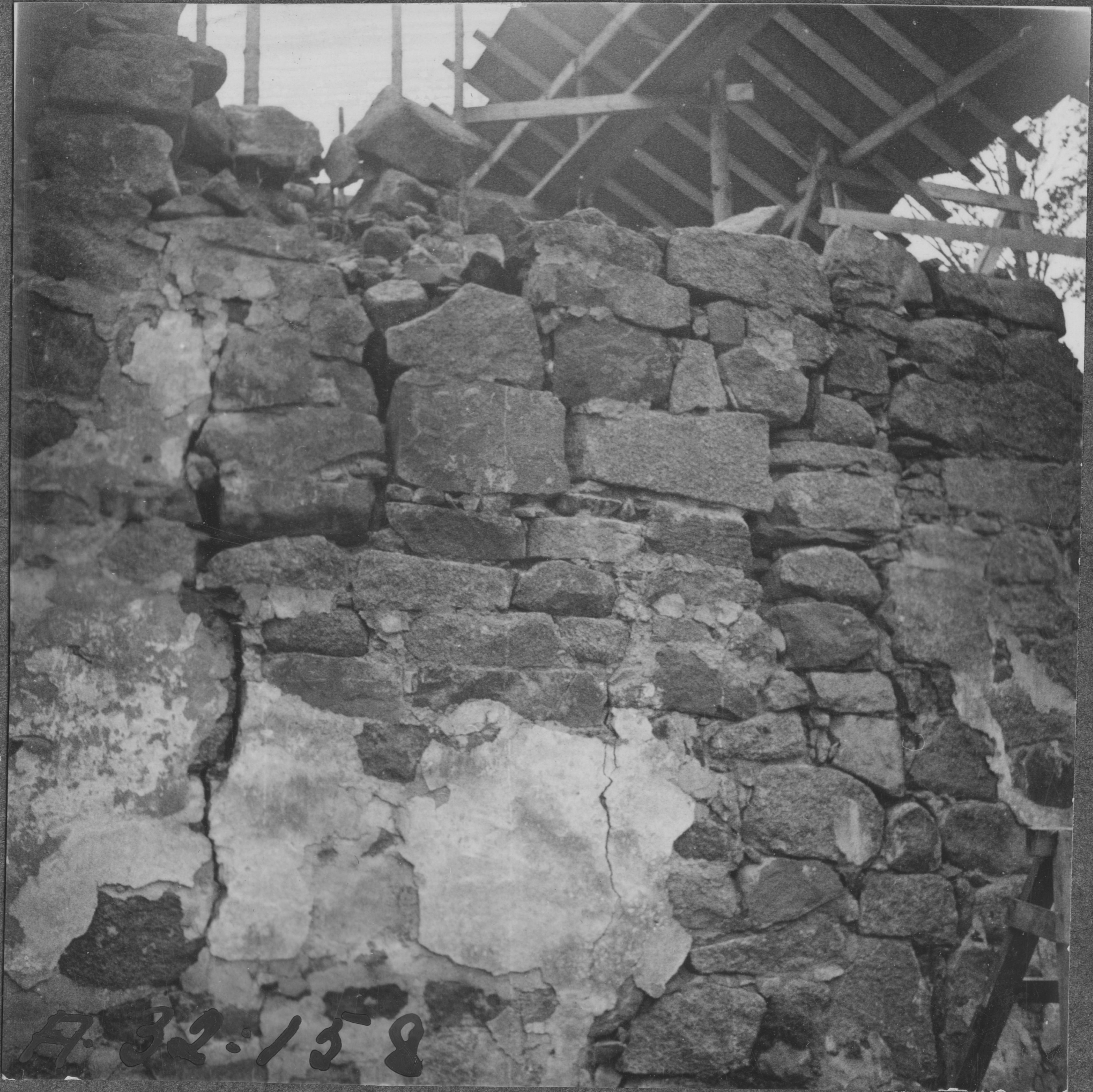 Beskrivning: Norra murens östar parti, spricka. Före restaurering. Från norr.