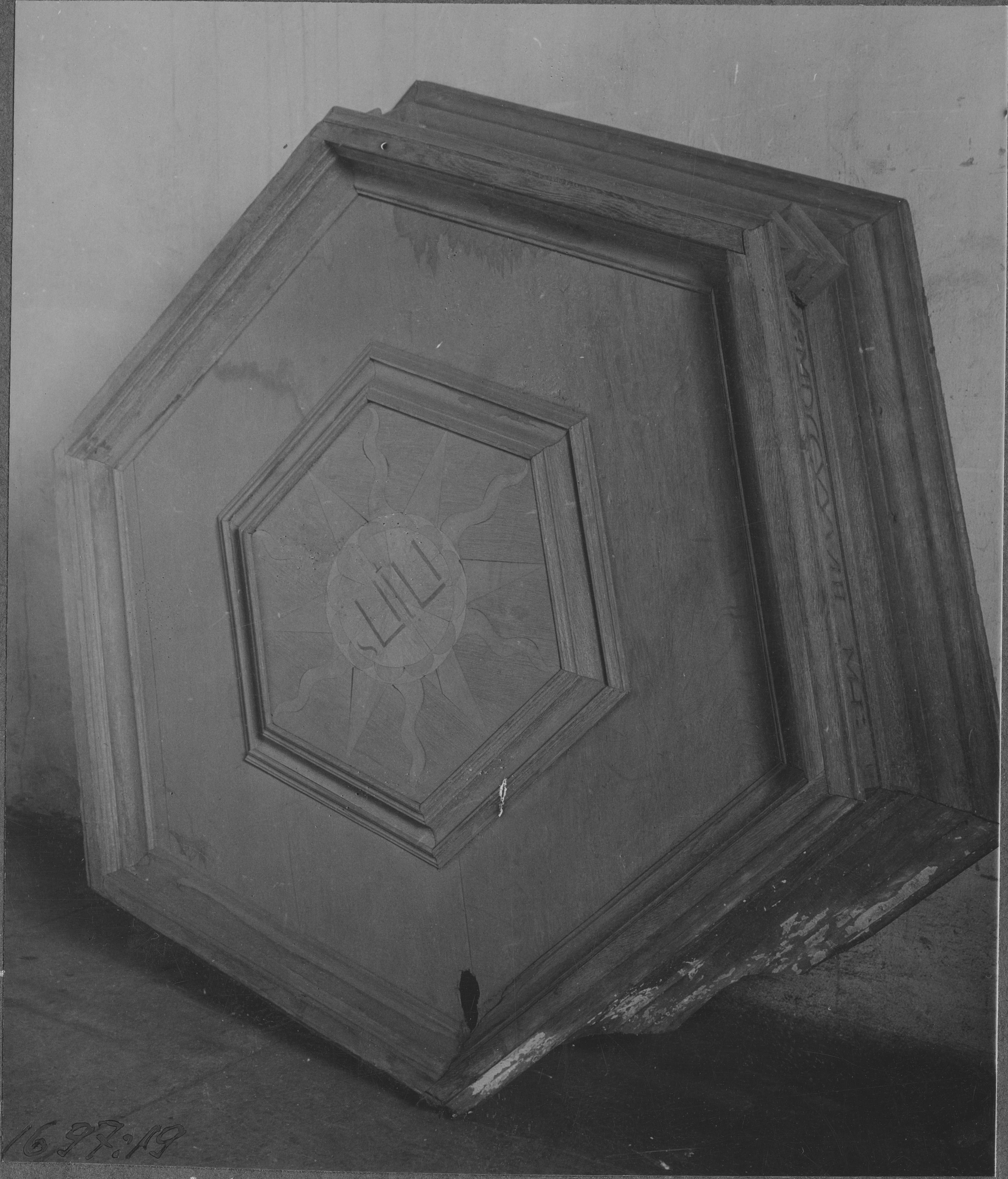 Beskrivning: Predikstolstak tillhörande predikstol daterad 1728. Från Högby gamla kyrka.
