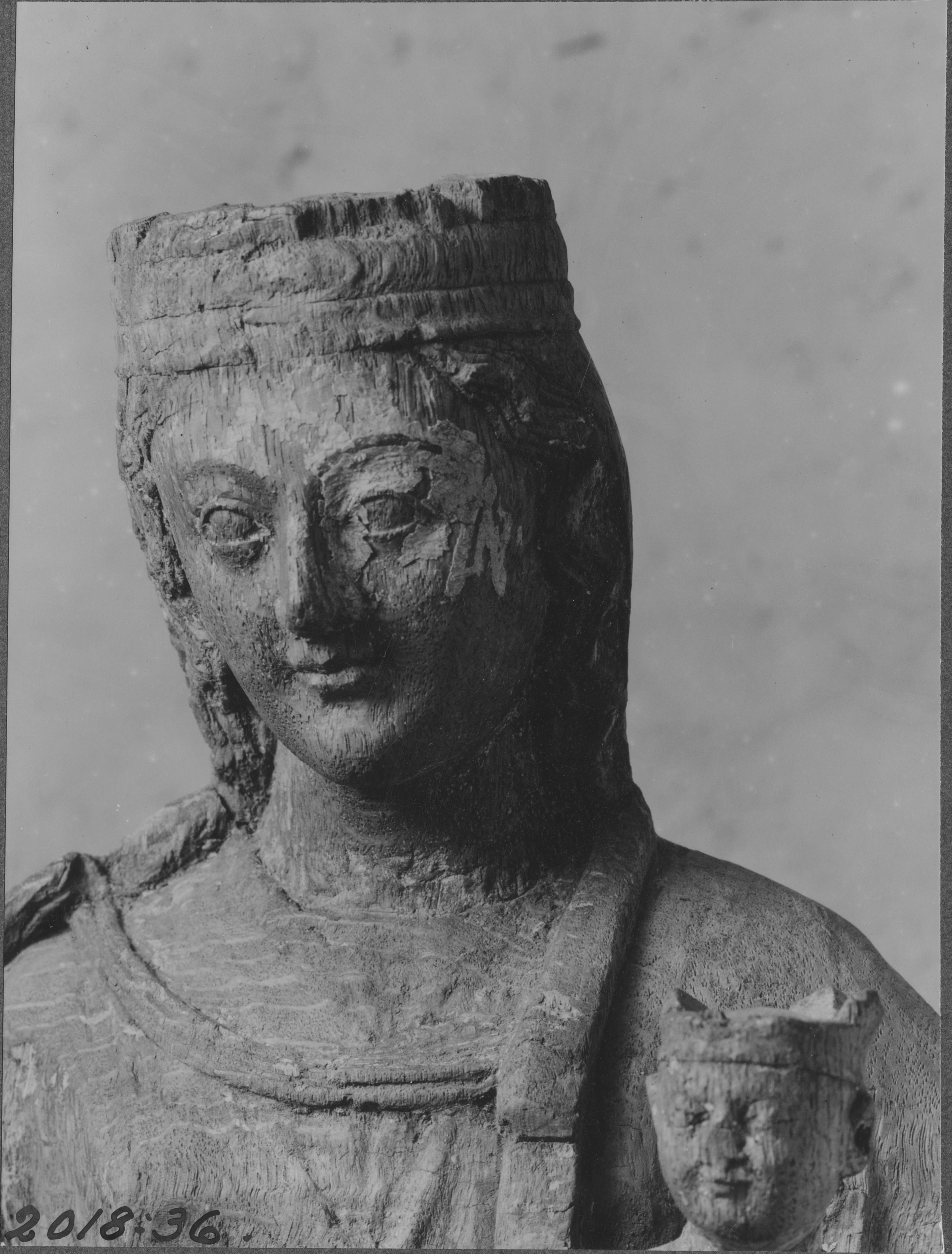 Beskrivning: Träskulptur av ek föreställande Maria och Kristus, detalj. Obetydliga färgspår. 1200-talet. Från Västra Skrukeby kyrka.