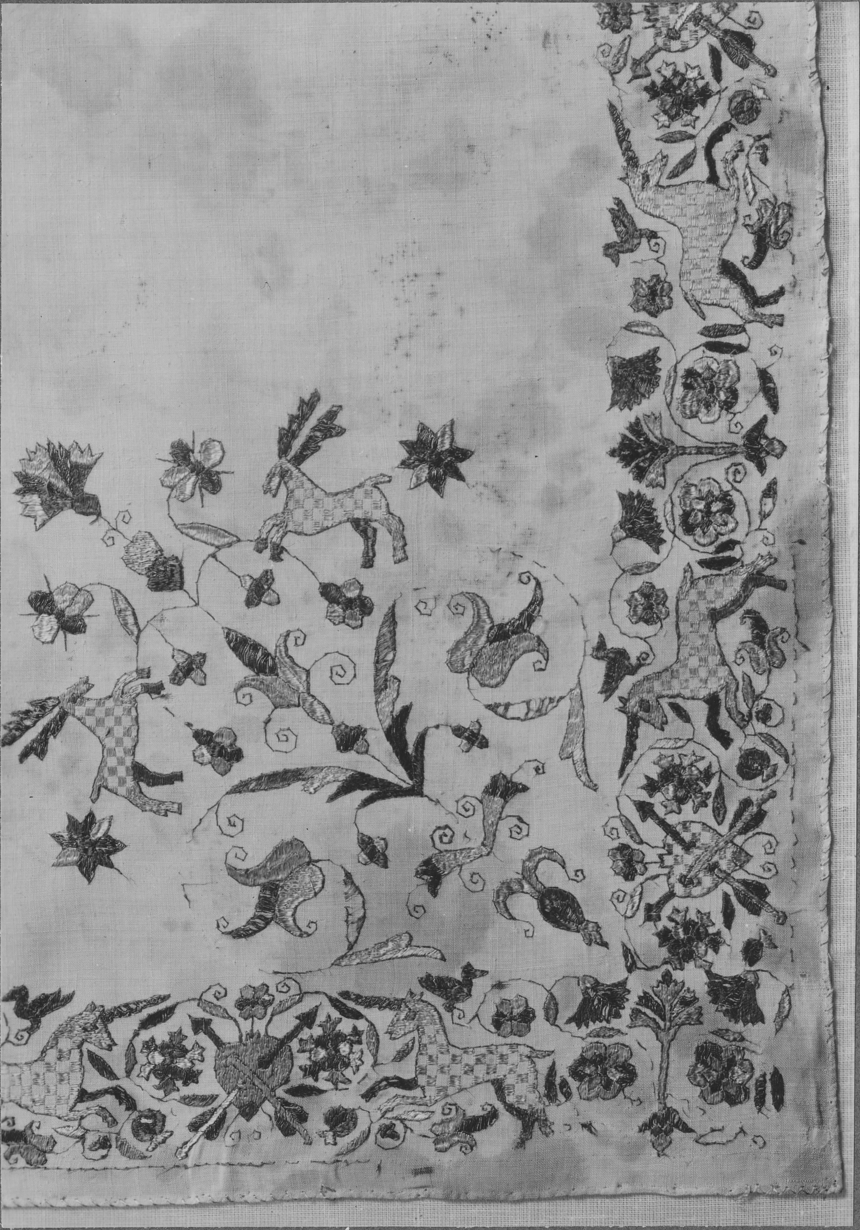 Beskrivning: Kalkduk av vitt linne med broderier av växter, enhörningar med mera. Ddetalj. Efter konservering.
