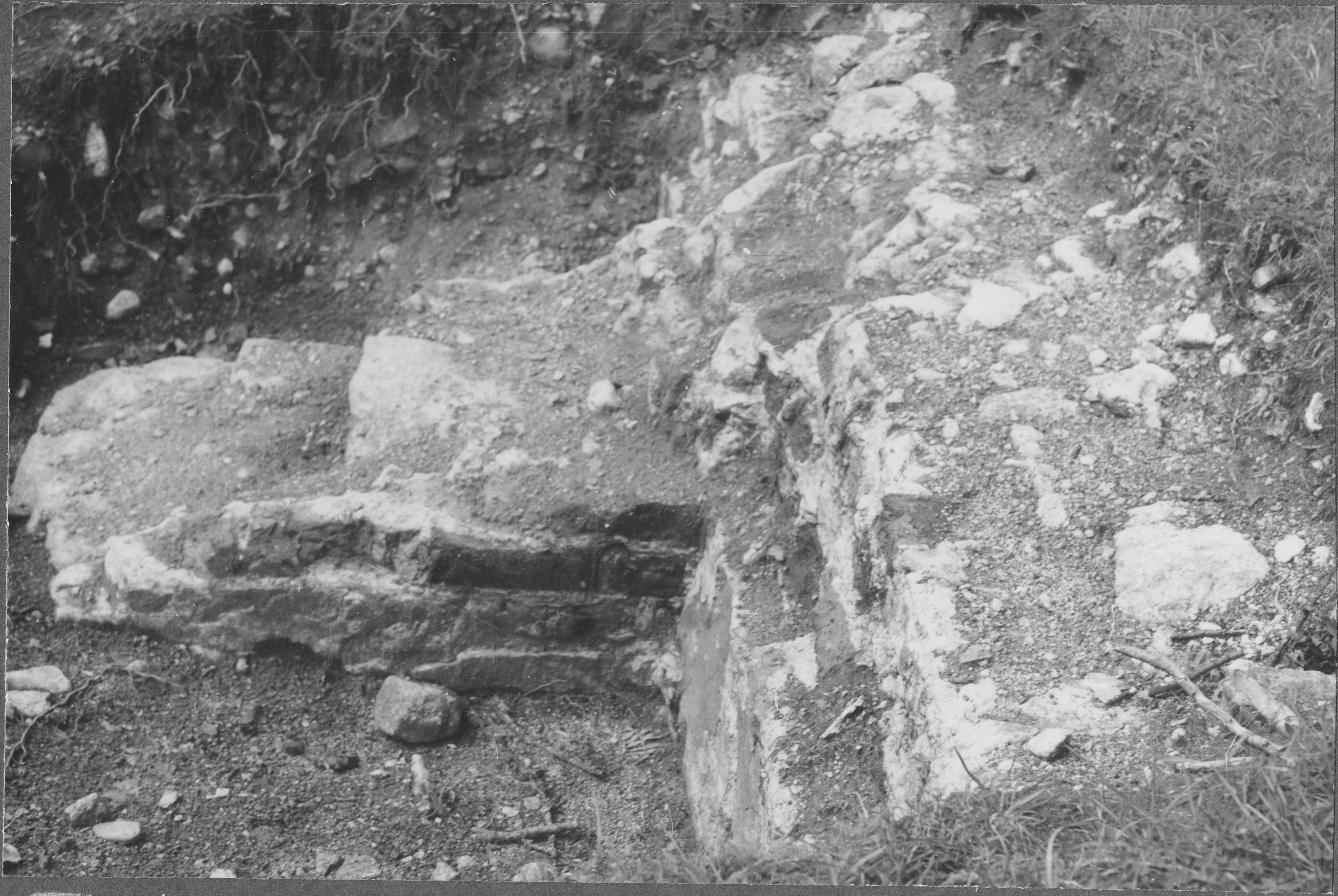 Beskrivning: Del av sydmuren samt bas till strävpelare i medeltidskyrkan. Framgrävd och åter övertäckt 1965. Från öster.