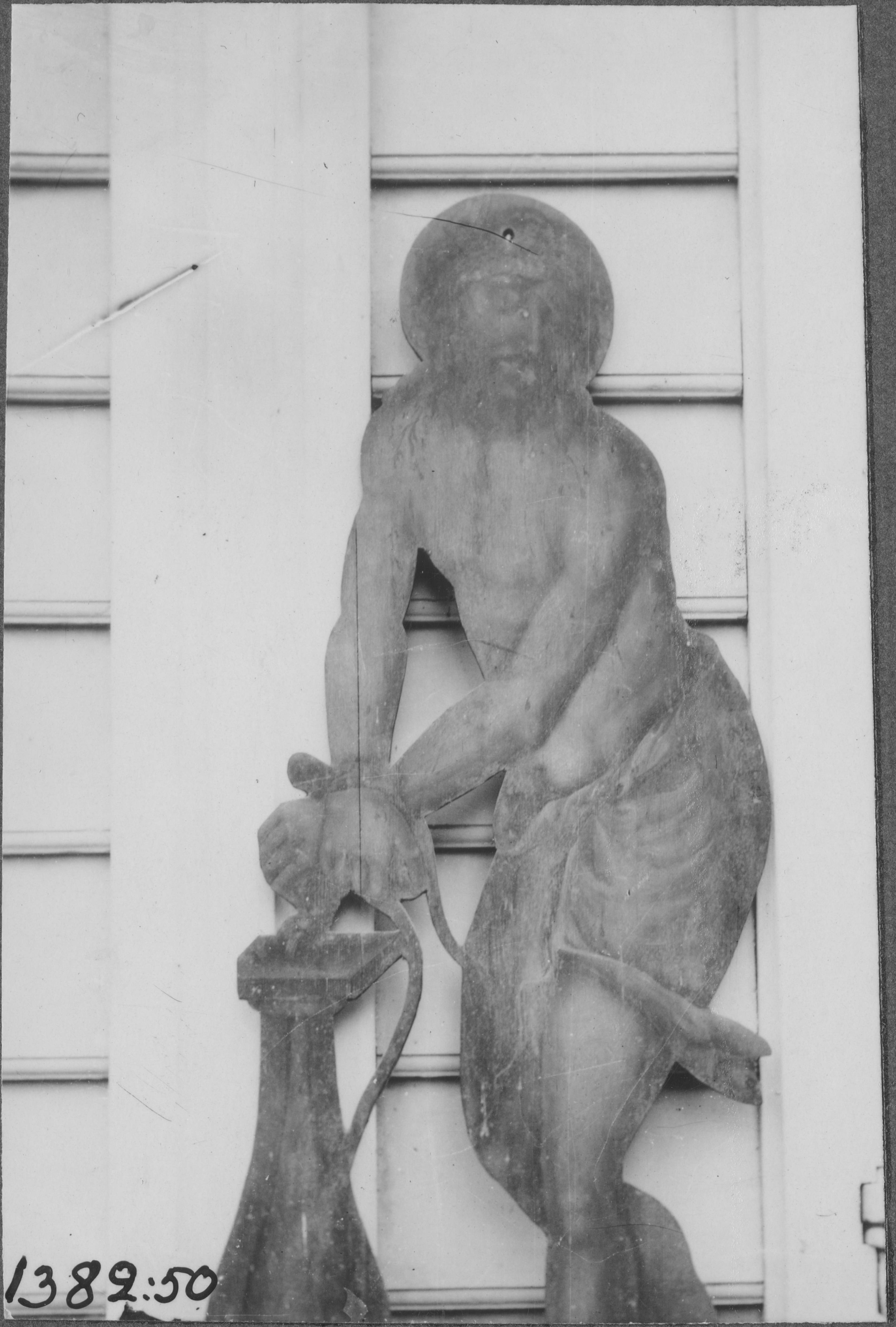Beskrivning: Krisutsbild föreställande Kristus med händerna fastbundna vid en pelare. Utskuren ur en plan träskiva och målad. Snabbinventering.