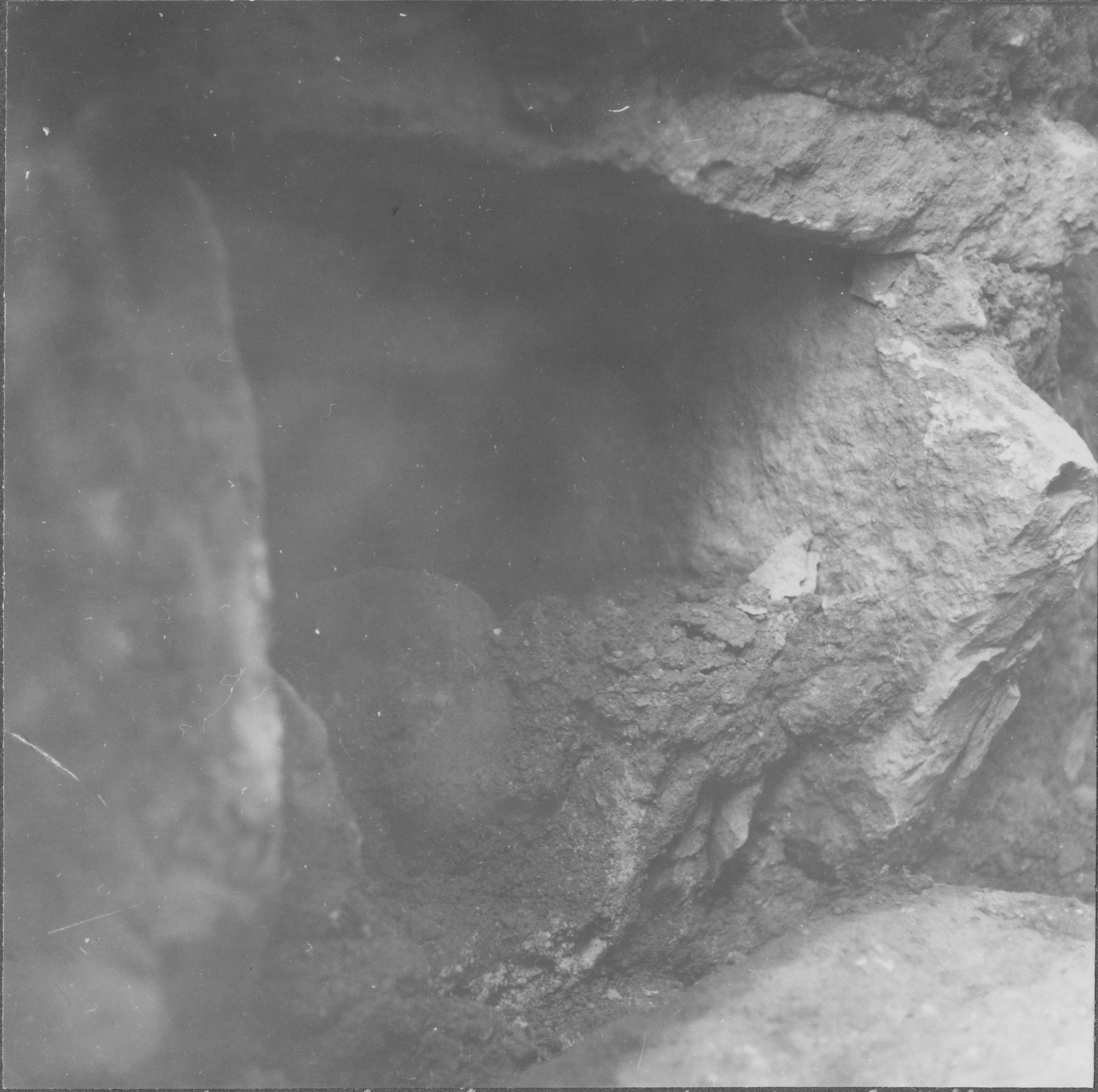 Beskrivning: Kalkstenskista med gravhällen borttagen. Obs murbrukskudden.