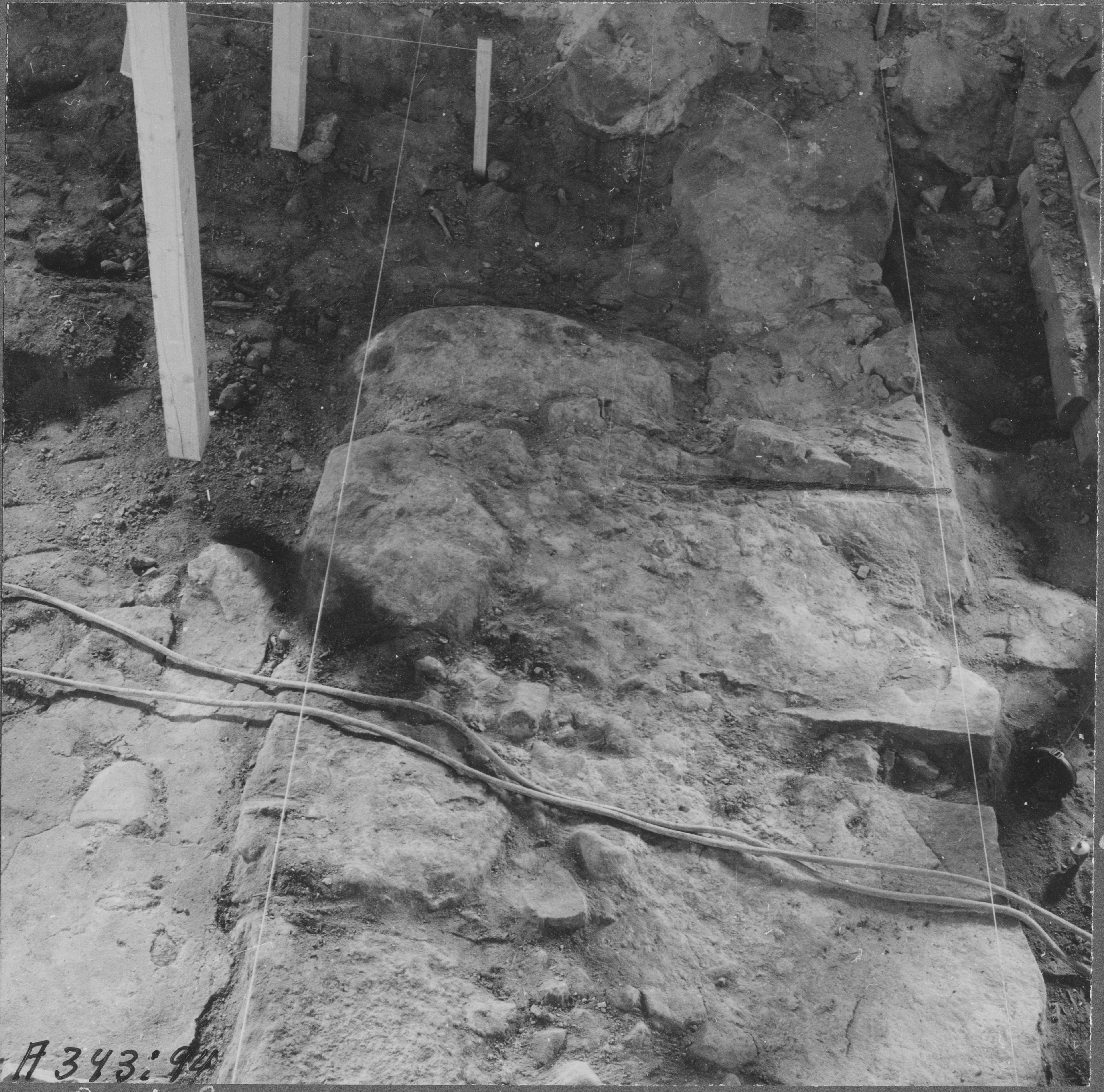 Beskrivning: Spår i form av putsavtryck efter triumfbågen, mot söder. Strecket markerar bågens södra sida.