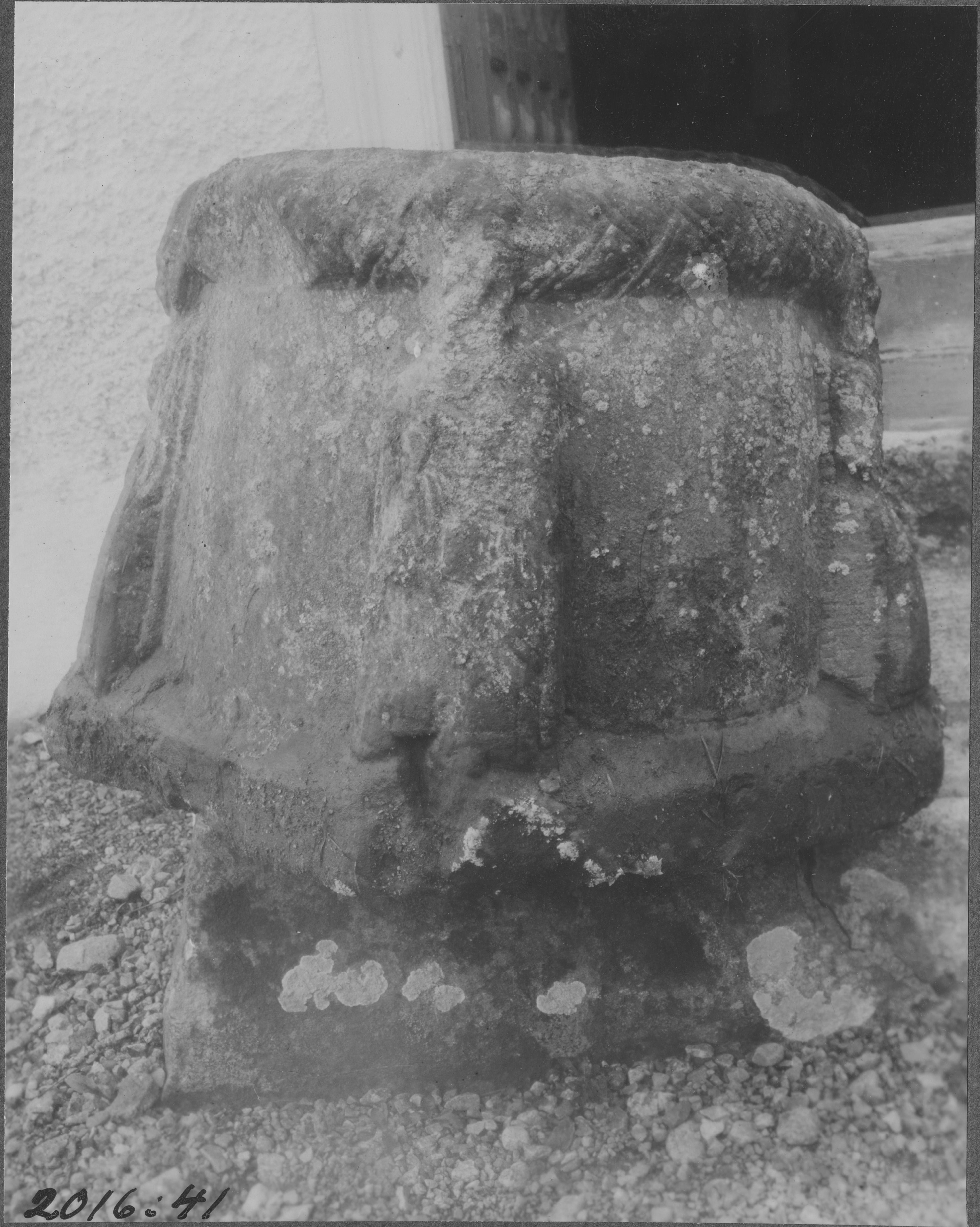 Beskrivning: Dopfuntsfot av kalksten. 1100-talet.